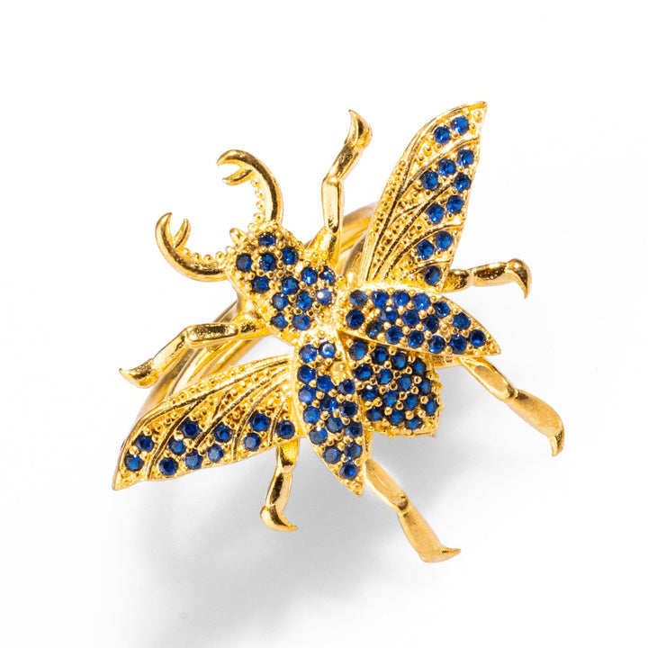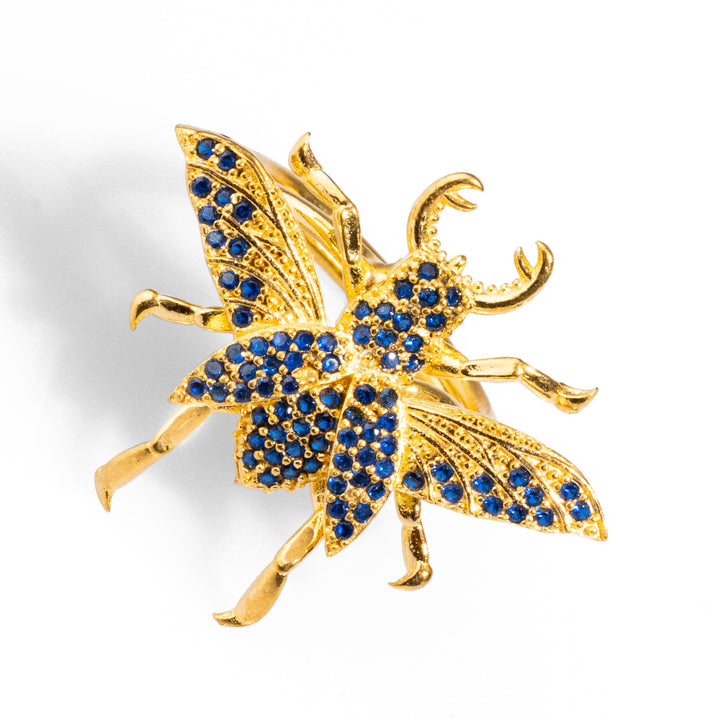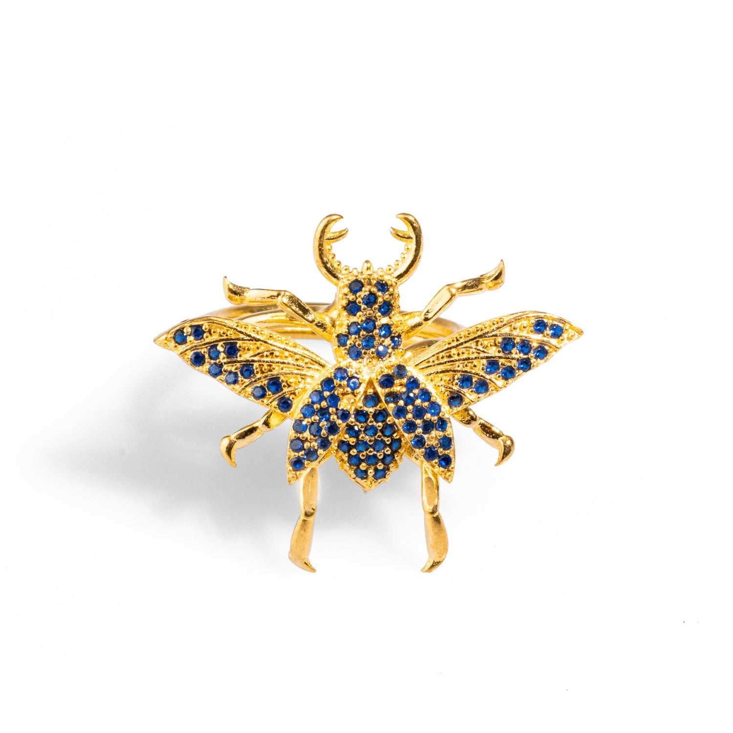 This ring is crafted from high-quality brass with 24k gold plating and features sapphire stones. The size is adjustable.