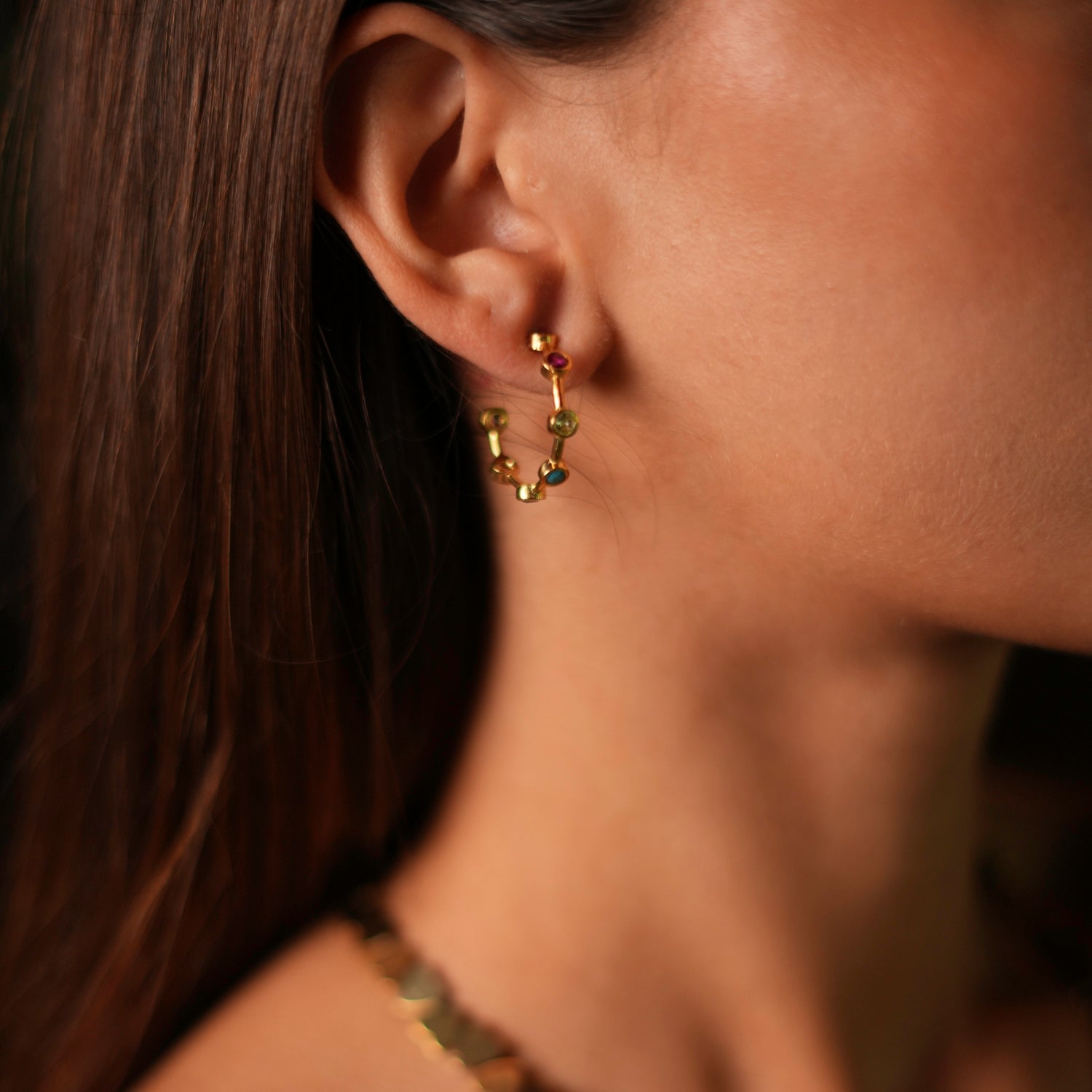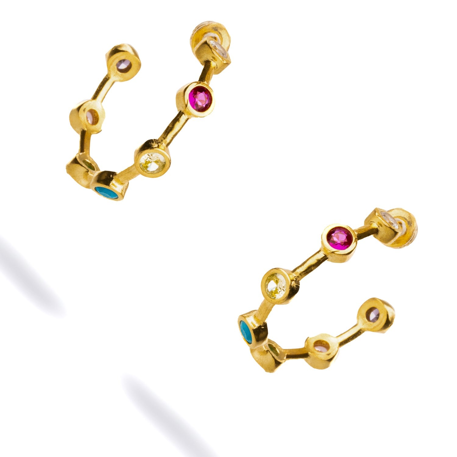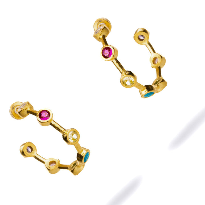 These hoops are crafted from high-quality brass and plated with 24k gold. They are embellished with sapphire, turquoise, ruby, and emerald stones.