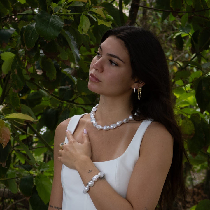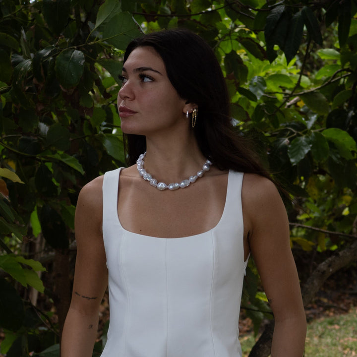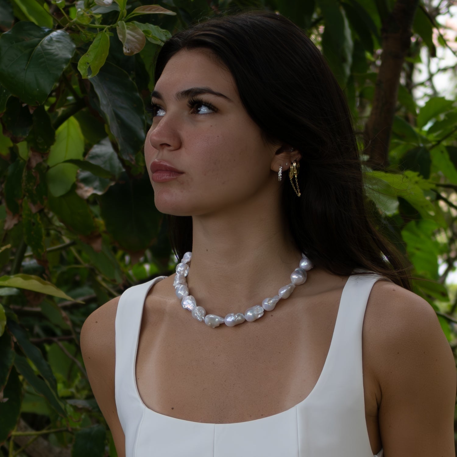 This Timeless Grace Baroque Pearl Necklace by Ebru Jewelry is a luxurious choker that celebrates the beauty of imperfection. Hand-strung with large, natural baroque pearls, each one is unique in shape and glow. This necklace is perfect for adding a touch of timeless elegance to both special events and everyday style, with a refined gold-plated clasp that completes the look.