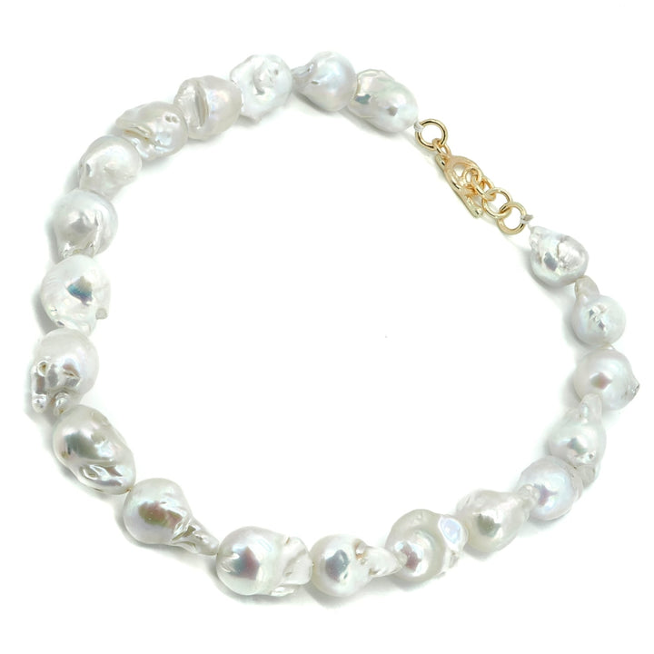 This choker is handmade in the United States from natural baroque pearls and features a gold-plated clasp. It is 15 inches in length.