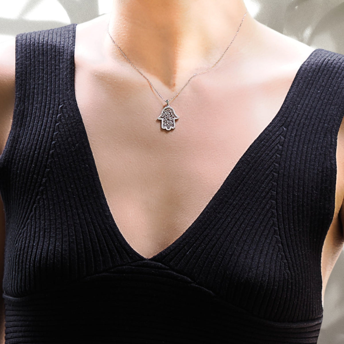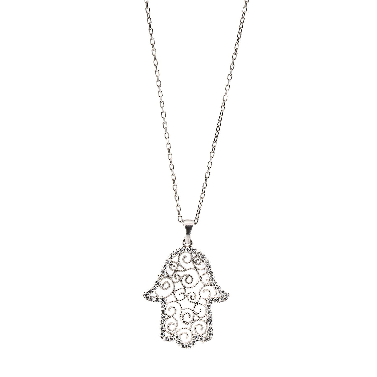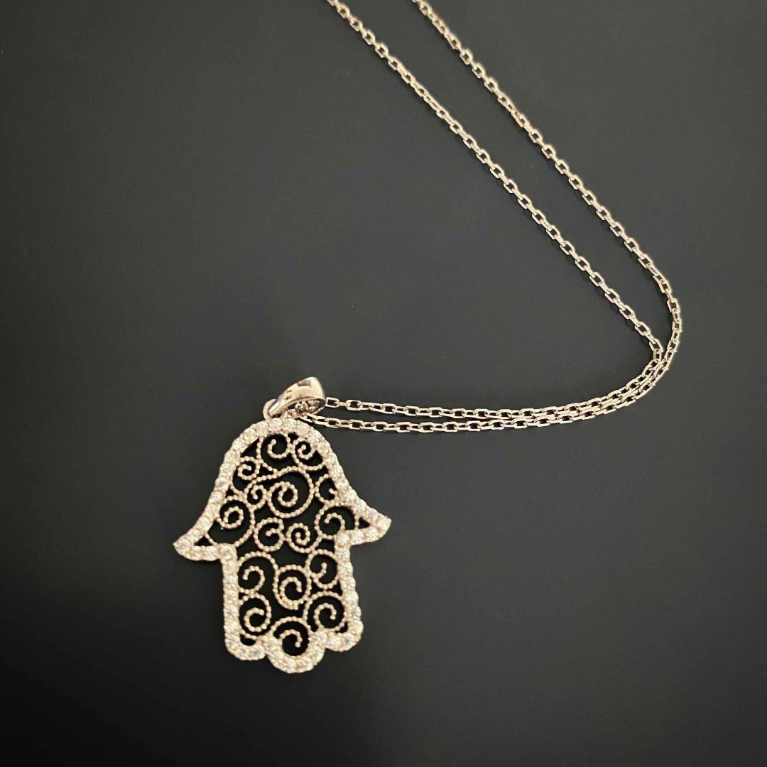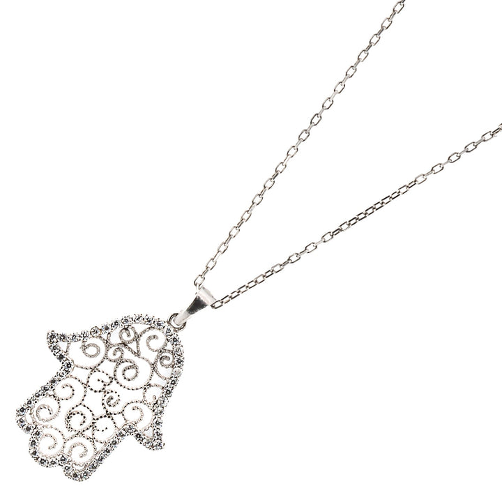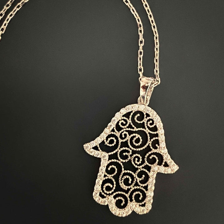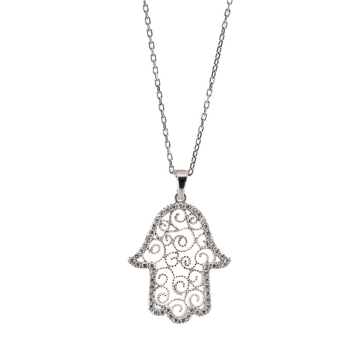 Spiral Design Hamsa Sterling Silver & Diamond Necklace - Silver
