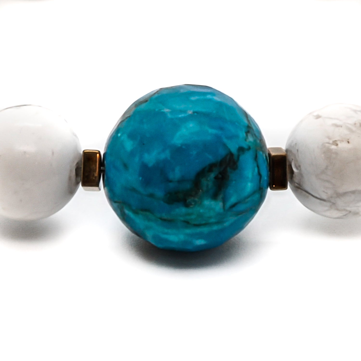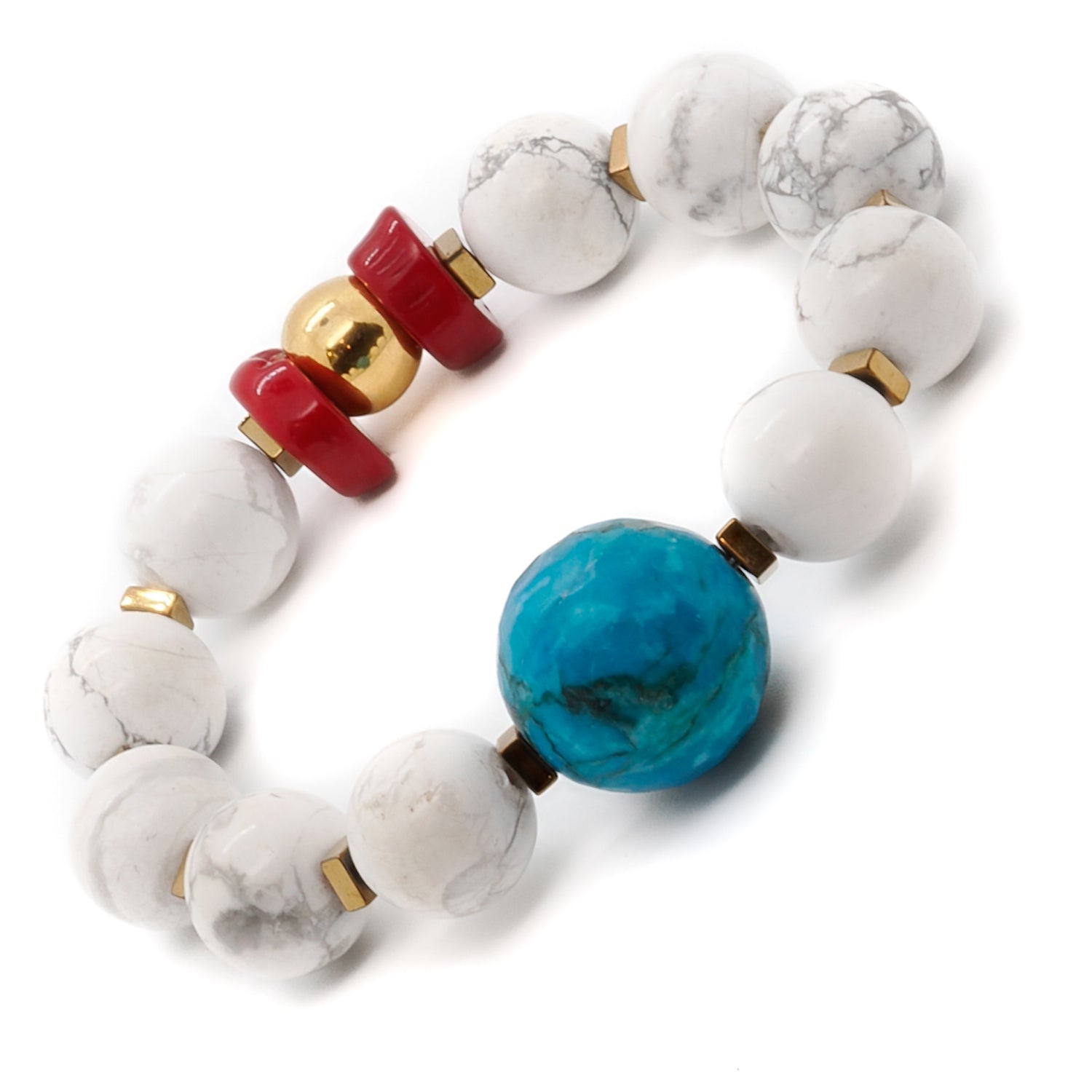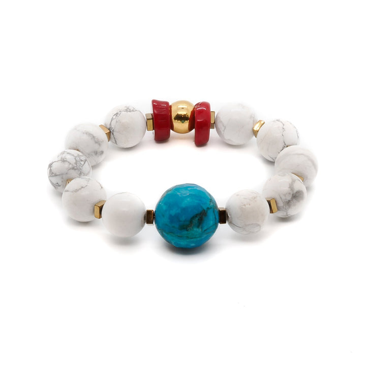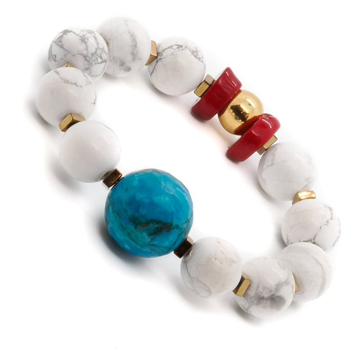 This handmade bracelet is crafted with 12mm howlite stone beads, 18mm turquoise stone beads, red nugget coral beads, and gold-colored hematite stone spacers. It also features a 925 sterling silver gold-plated bead. The bracelet size is 6.5".