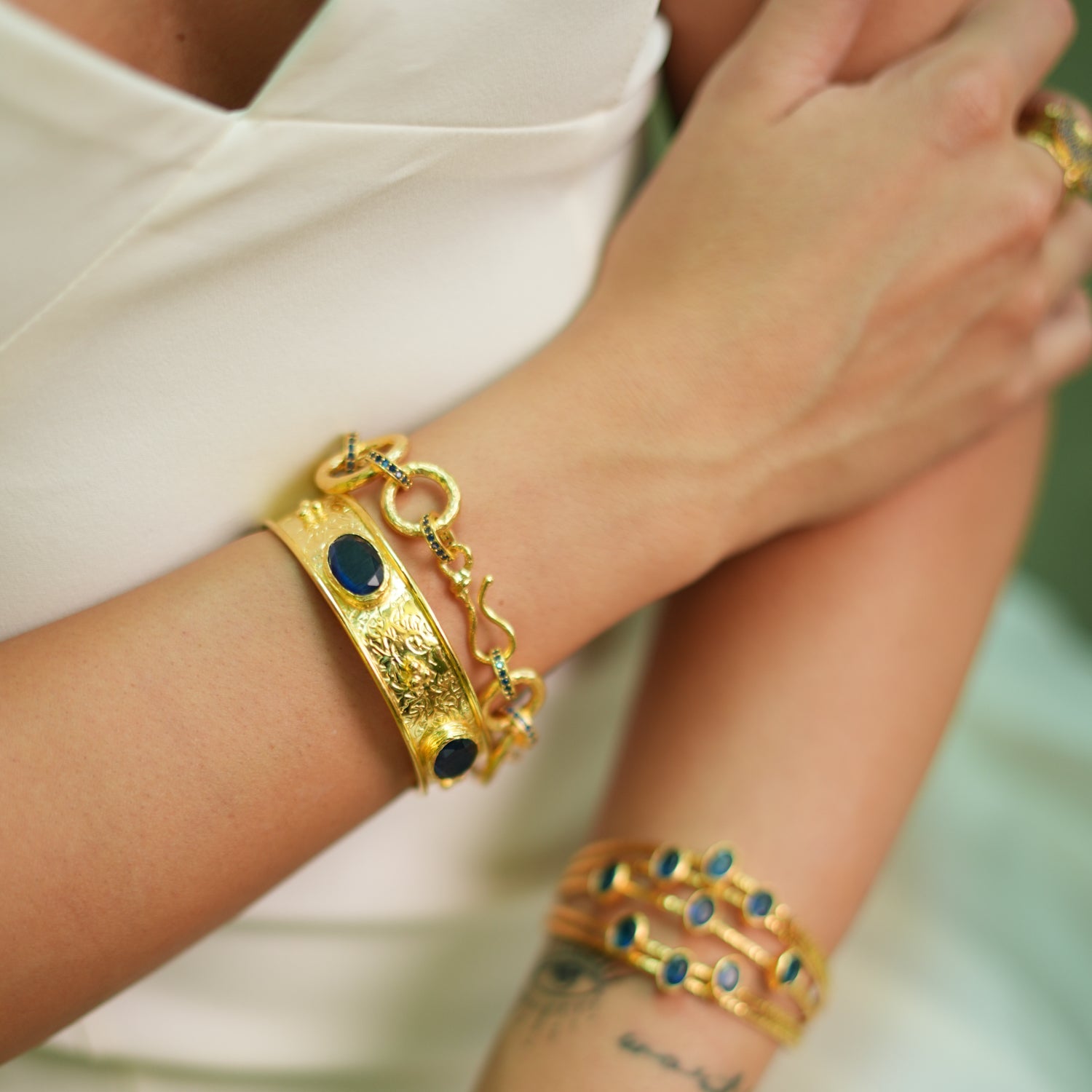 Cleopatra Sapphire Gemstone & Gold Antique Cuff Bracelet - Blue