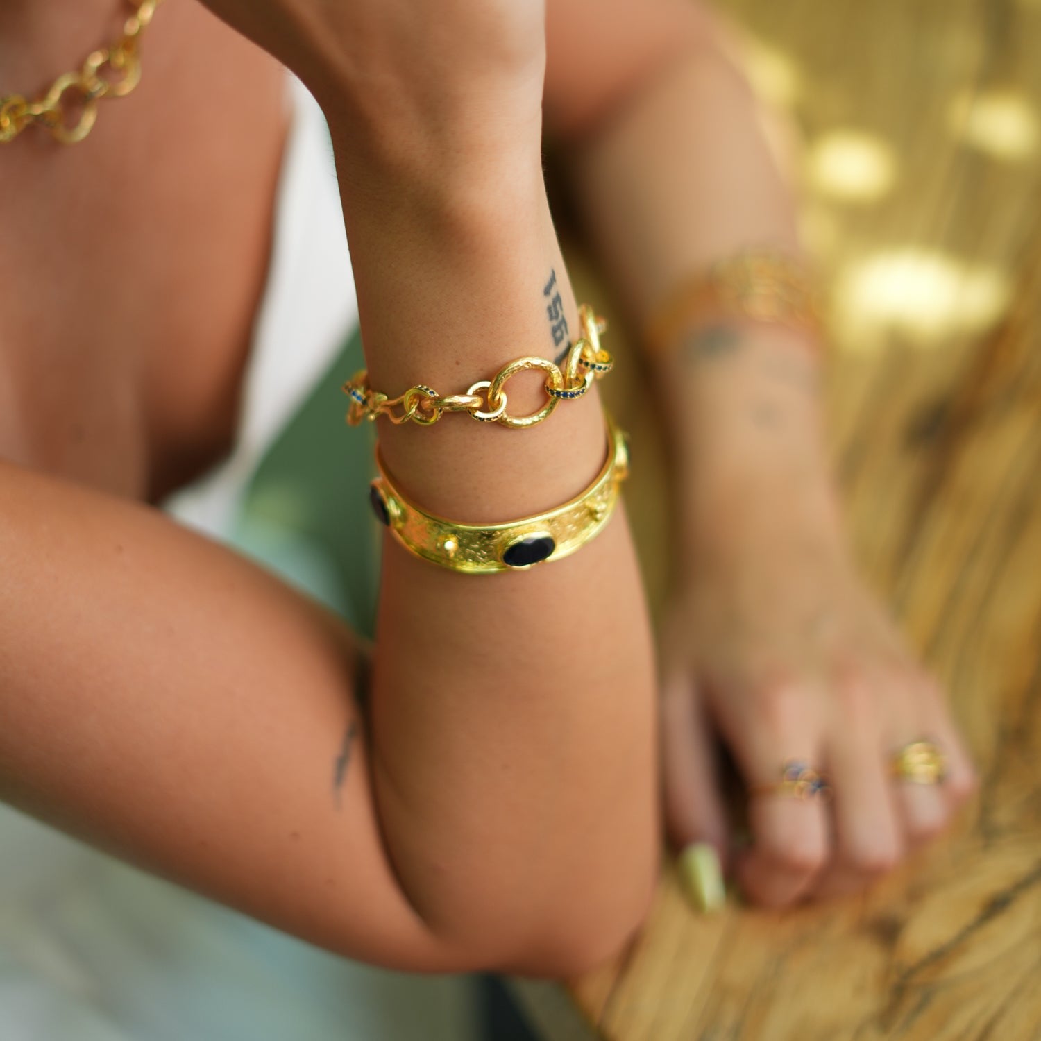 This Cleopatra Sapphire Gemstone & Gold Antique Cuff Bracelet by Ebru Jewelry is a bold and luxurious piece. Adorned with intricate, antique-inspired designs, it features three large sapphire gemstones that radiate with high energy and deep elegance. The unique craftsmanship and striking stones make this a standout accessory, perfect for adding a touch of sophisticated power to any outfit and symbolizing confidence and opulence.