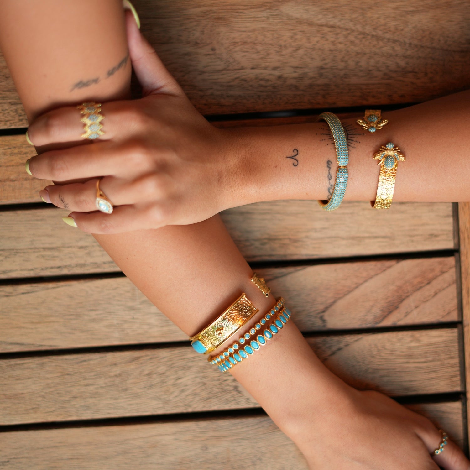 This adjustable cuff bracelet is crafted from high-quality brass and plated with 24k gold. It is adorned with two turquoise stones.