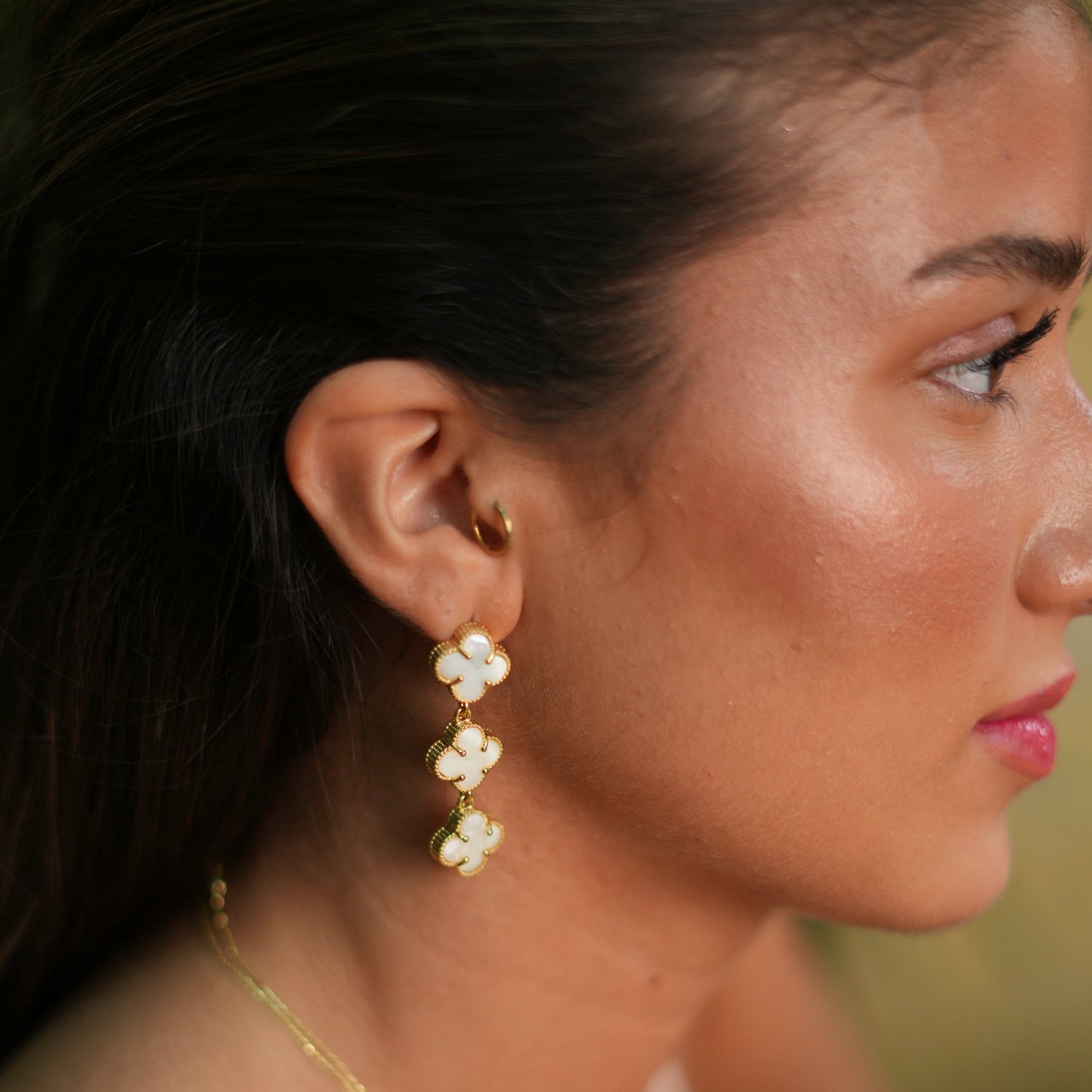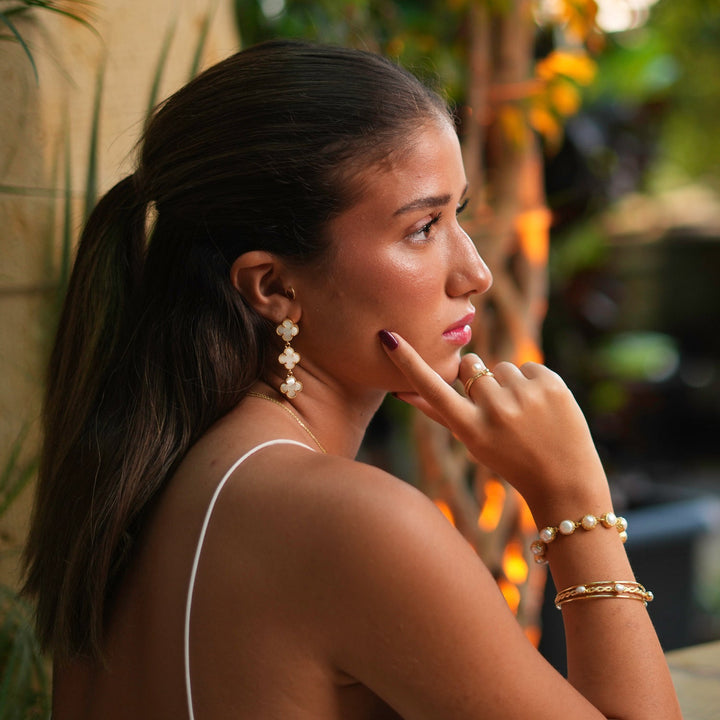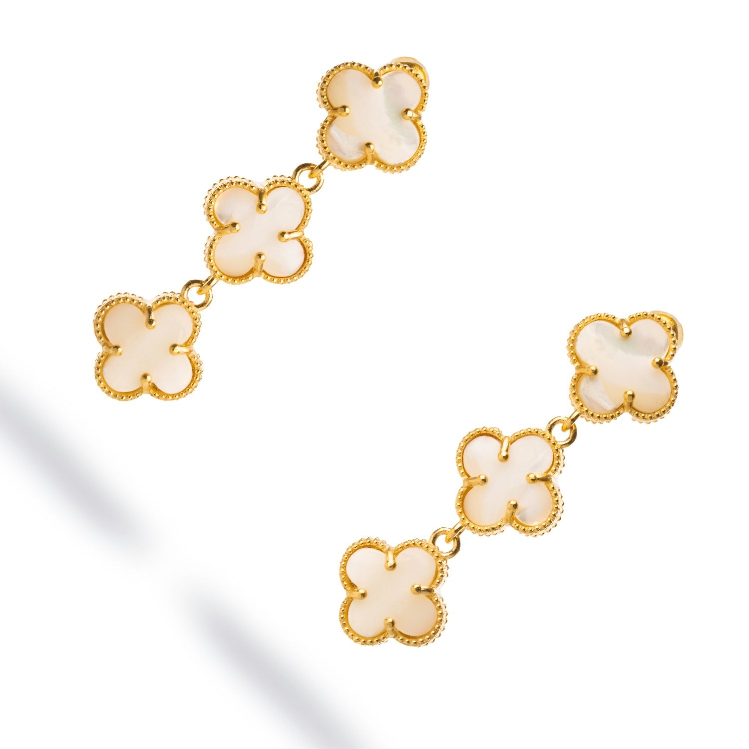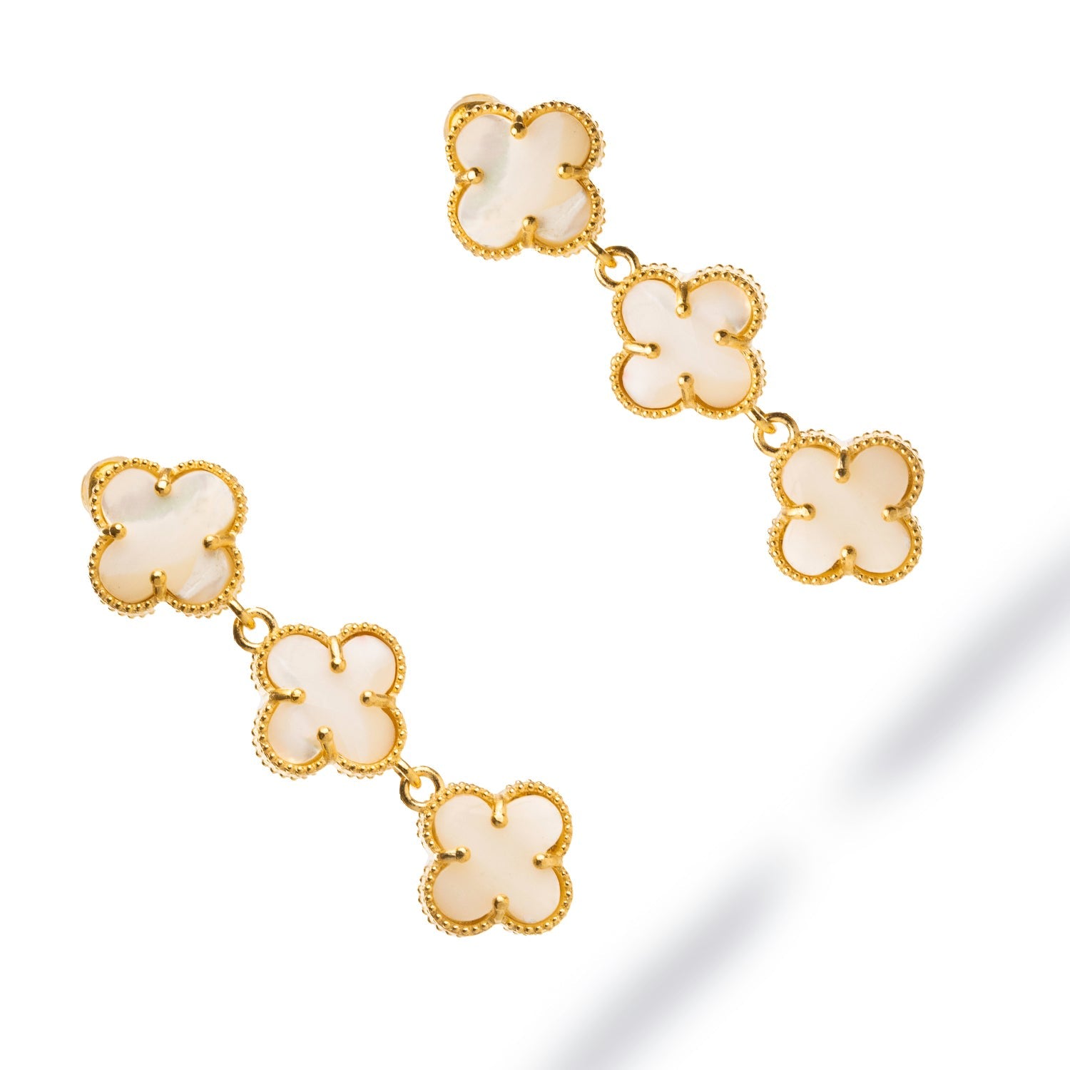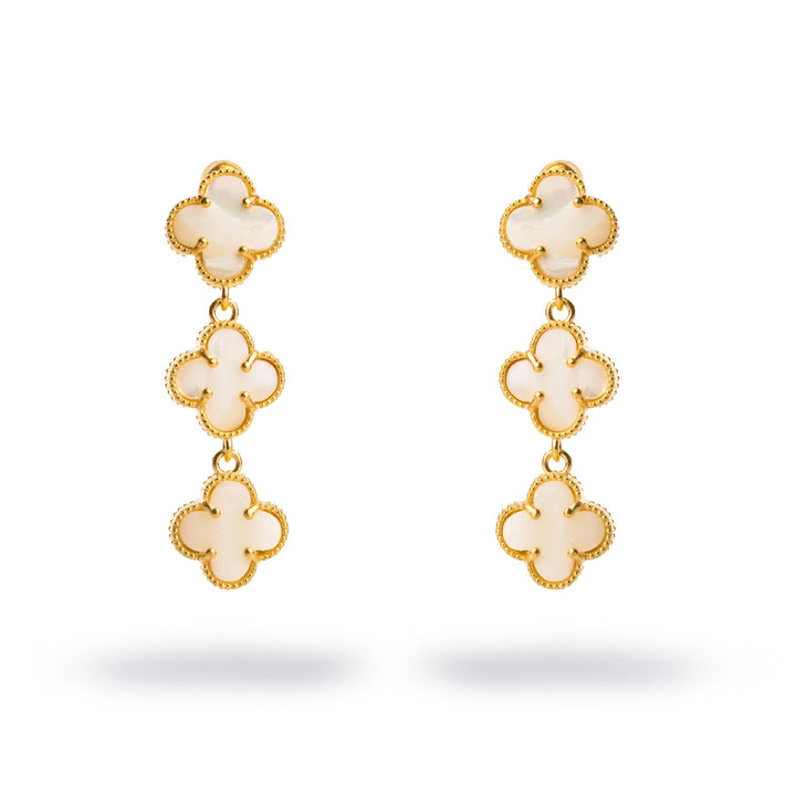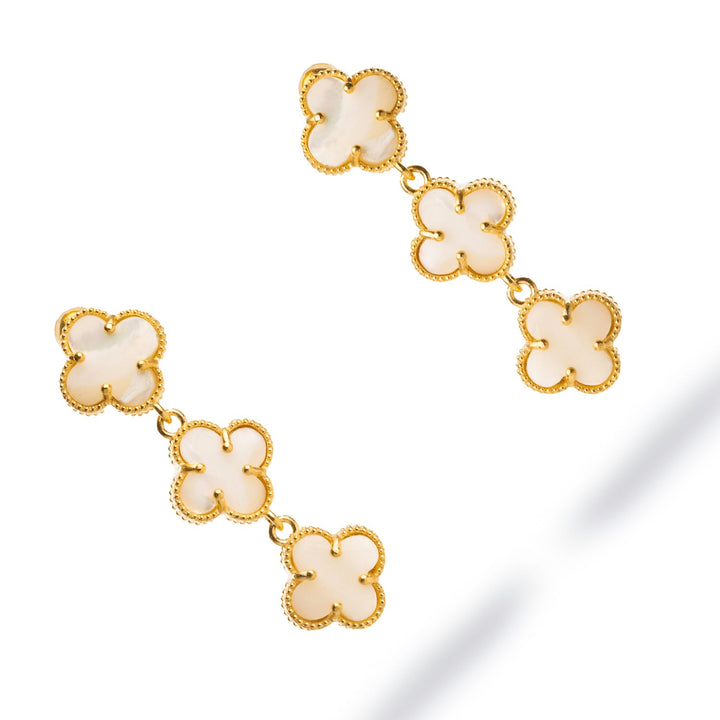 Triple Pearl Clover Gold Dangle Elegant Earrings - White