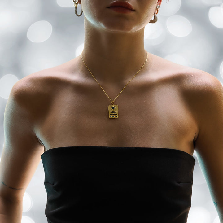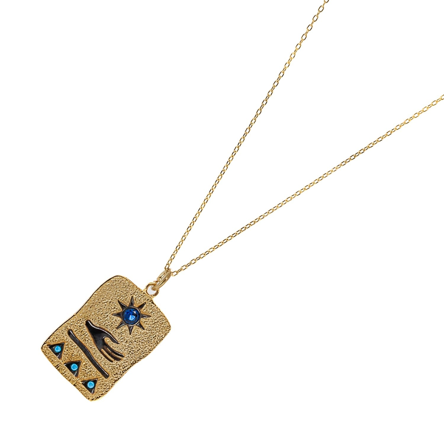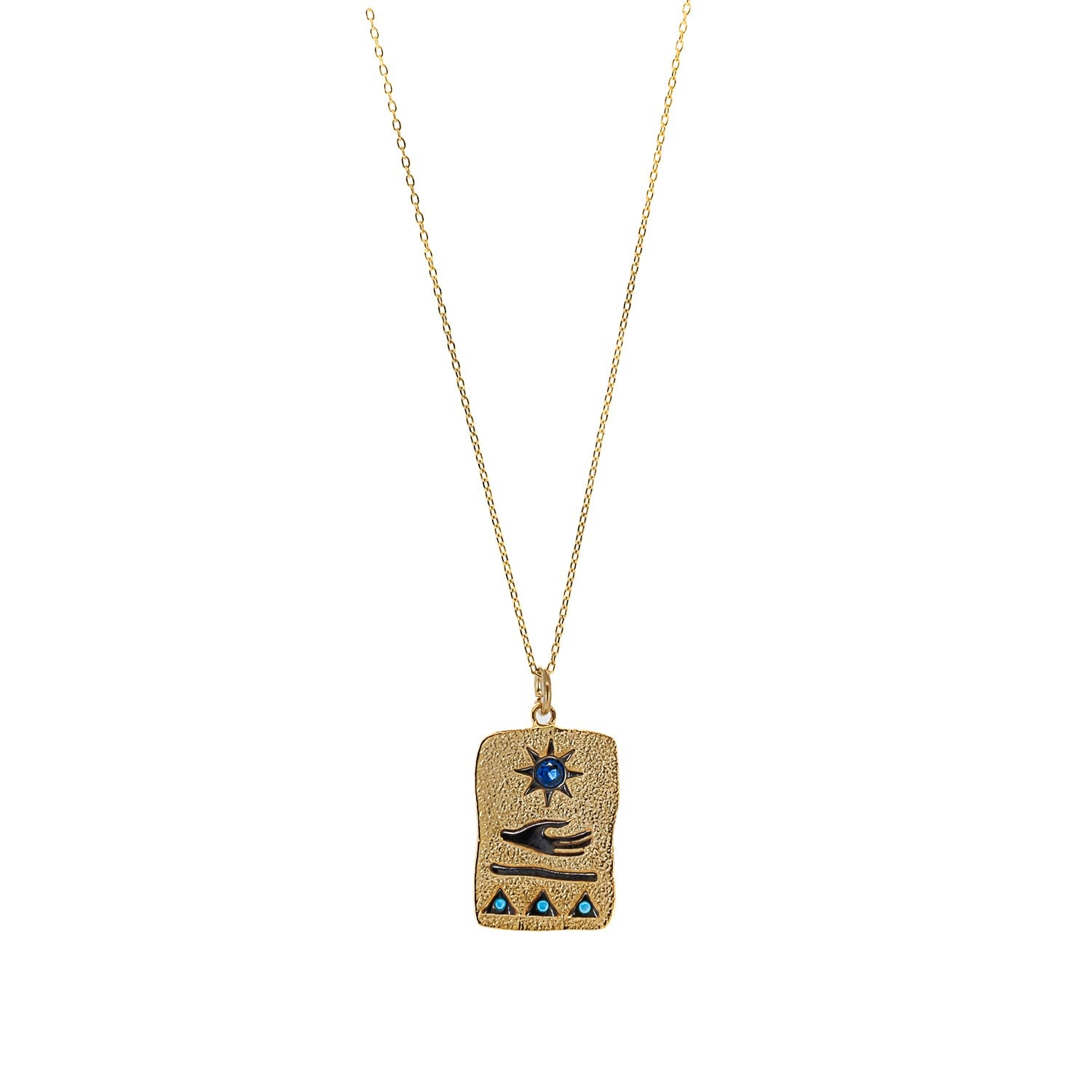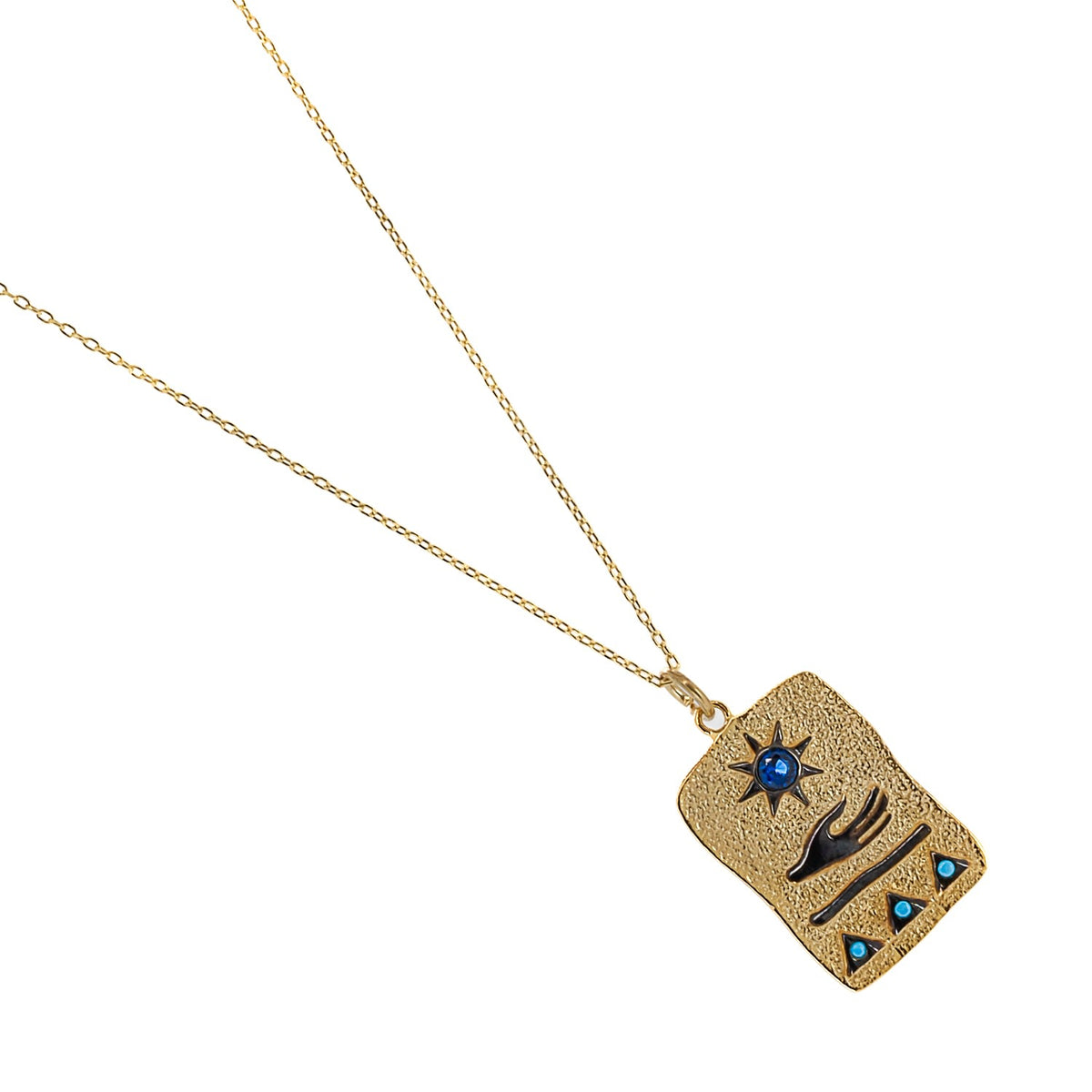 The Egyptian All In Your Hands Sun Gold Necklace by Ebru Jewelry is a captivating and symbolic accessory. The pendant hangs from a sterling silver chain luxuriously coated with 24K gold plating. The necklace features a sun pendant with a sapphire gemstone at its heart and turquoise pyramids.