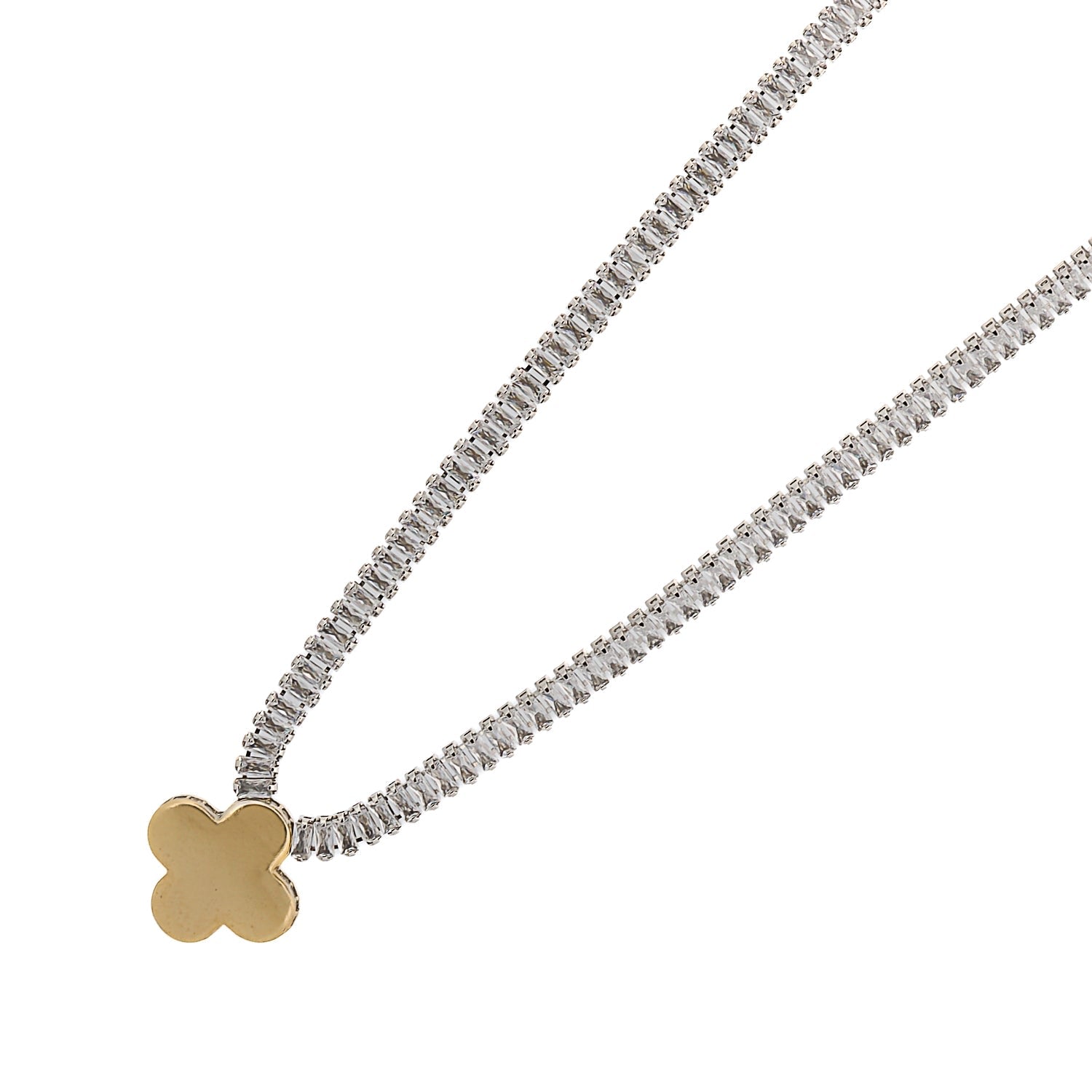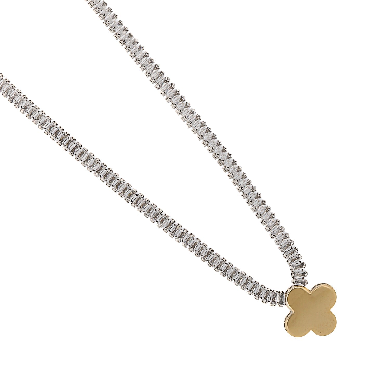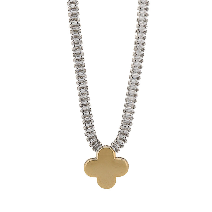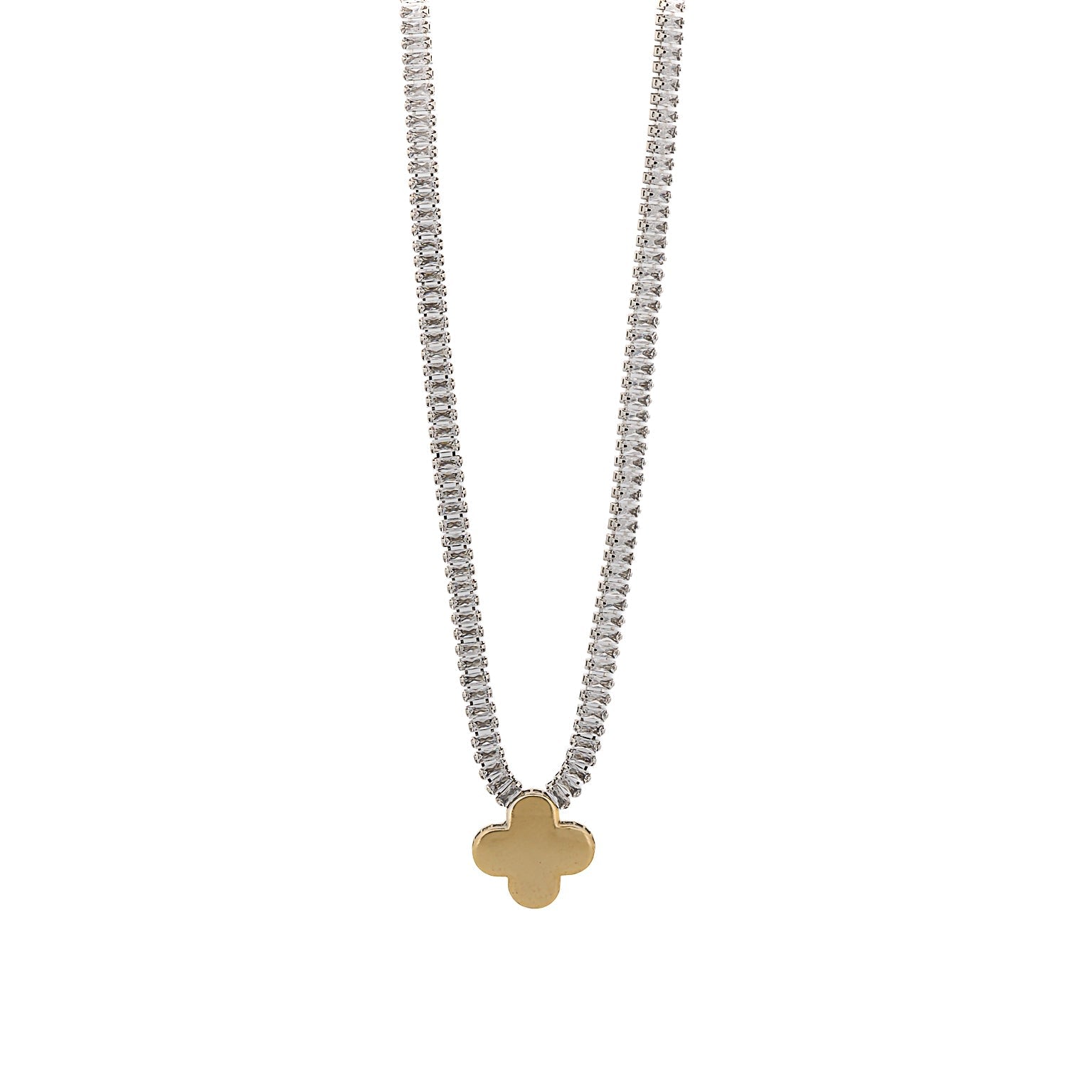 Gold Clover Charm Baguette Diamond Necklace - Gold