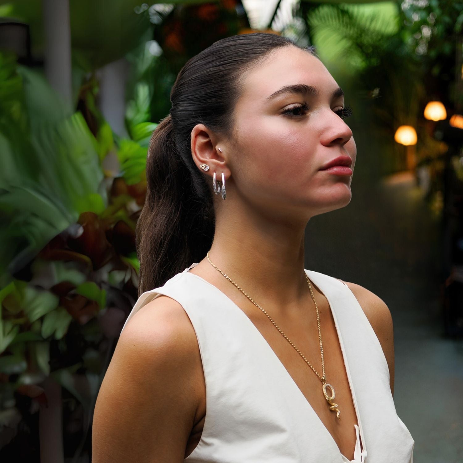 These hoop earrings are made of a brass base with 18K Gold plating and are set with Cz diamonds.
