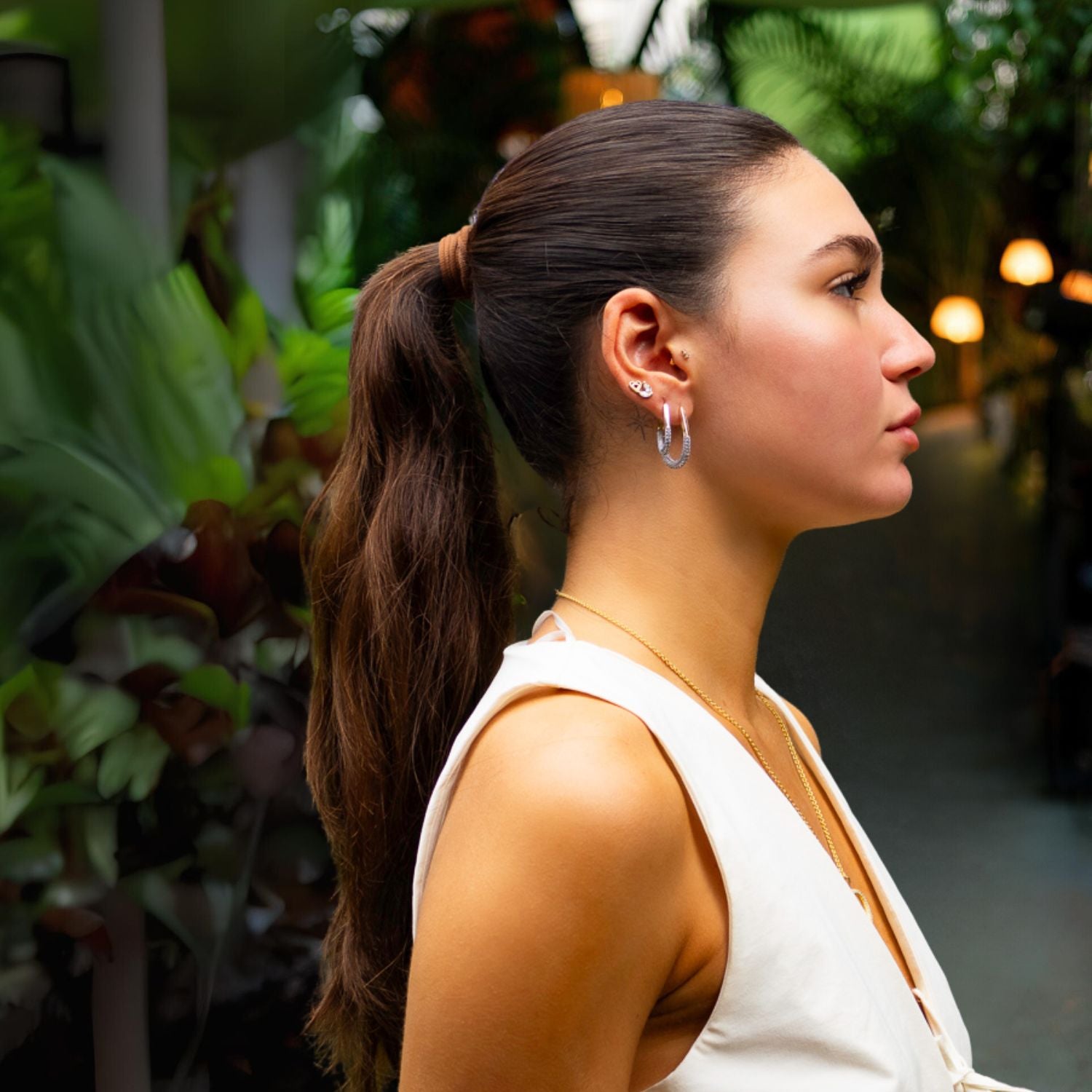 The Pave Diamonds Gold Hoop Mid Size Earrings - Silver by Ebru Jewelry are a glamorous and sophisticated accessory. These hoop earrings feature a high-quality metal base with luxurious 18k gold plating and are set with Cz diamonds in a pave setting.
