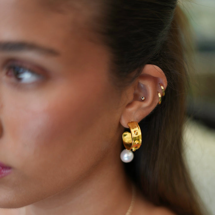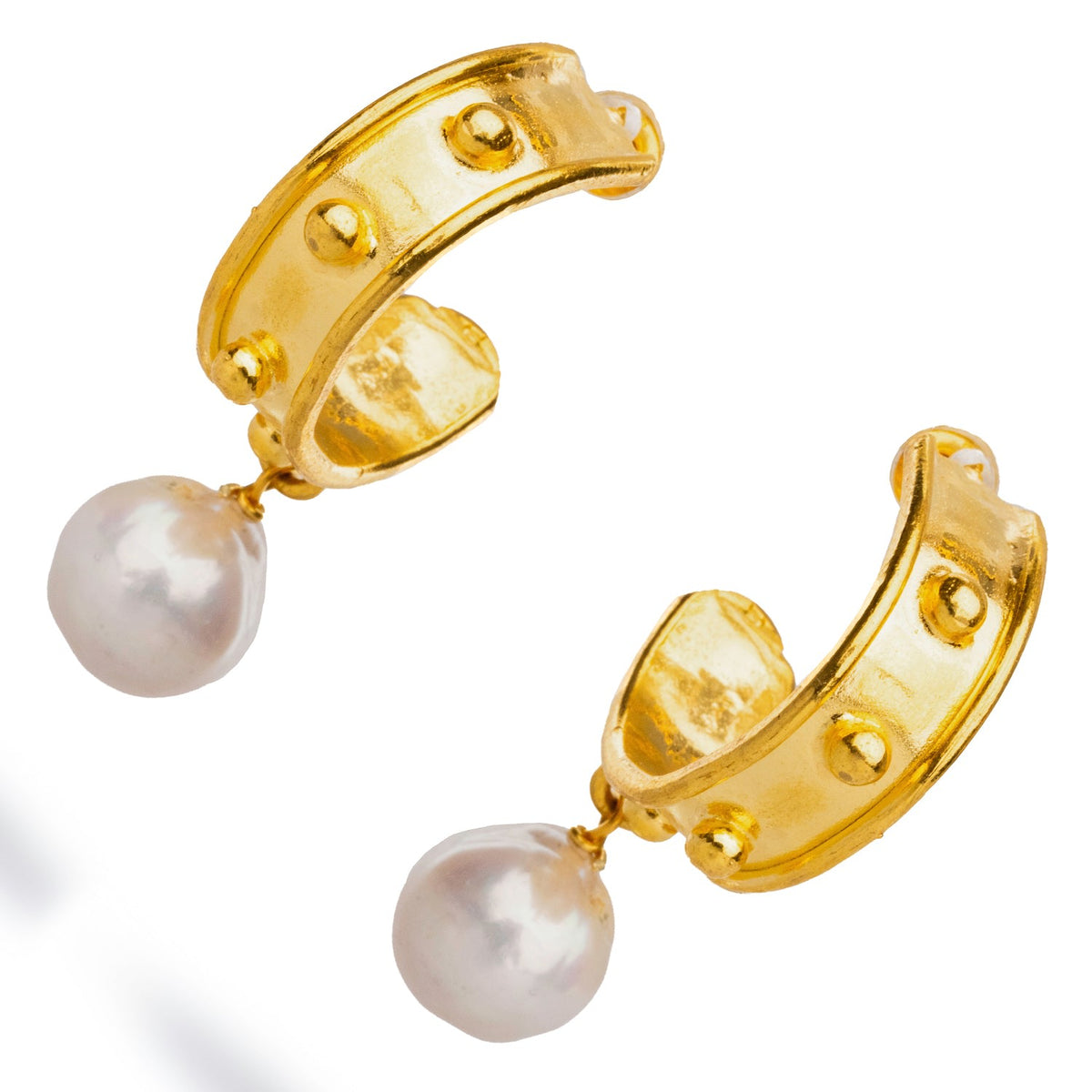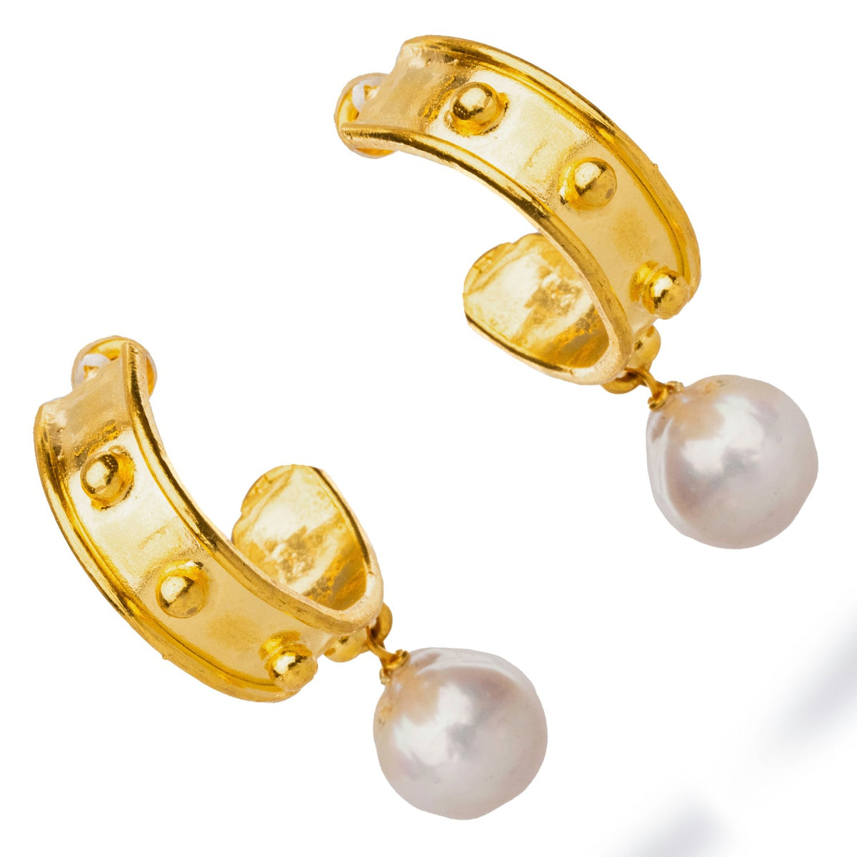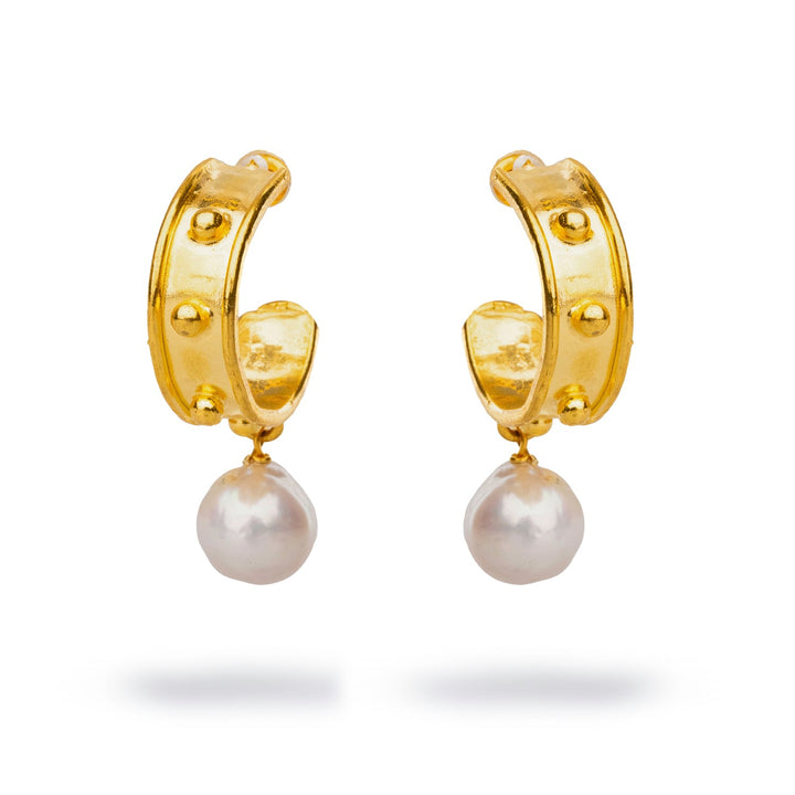 These hoop earrings are crafted from 24k gold-plated brass with a pearl stone.