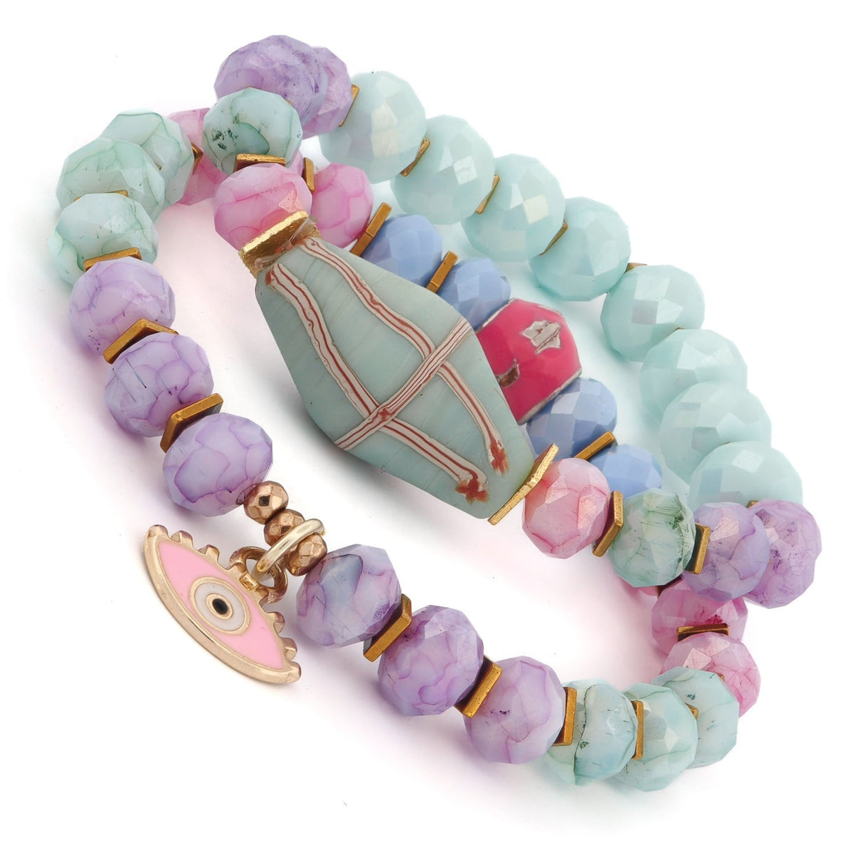 This bracelet set is made with an 18k gold-plated pink enamel evil eye charm, pastel multicolor crystal beads, and gold hematite spacers. The bracelet size is 6.5".