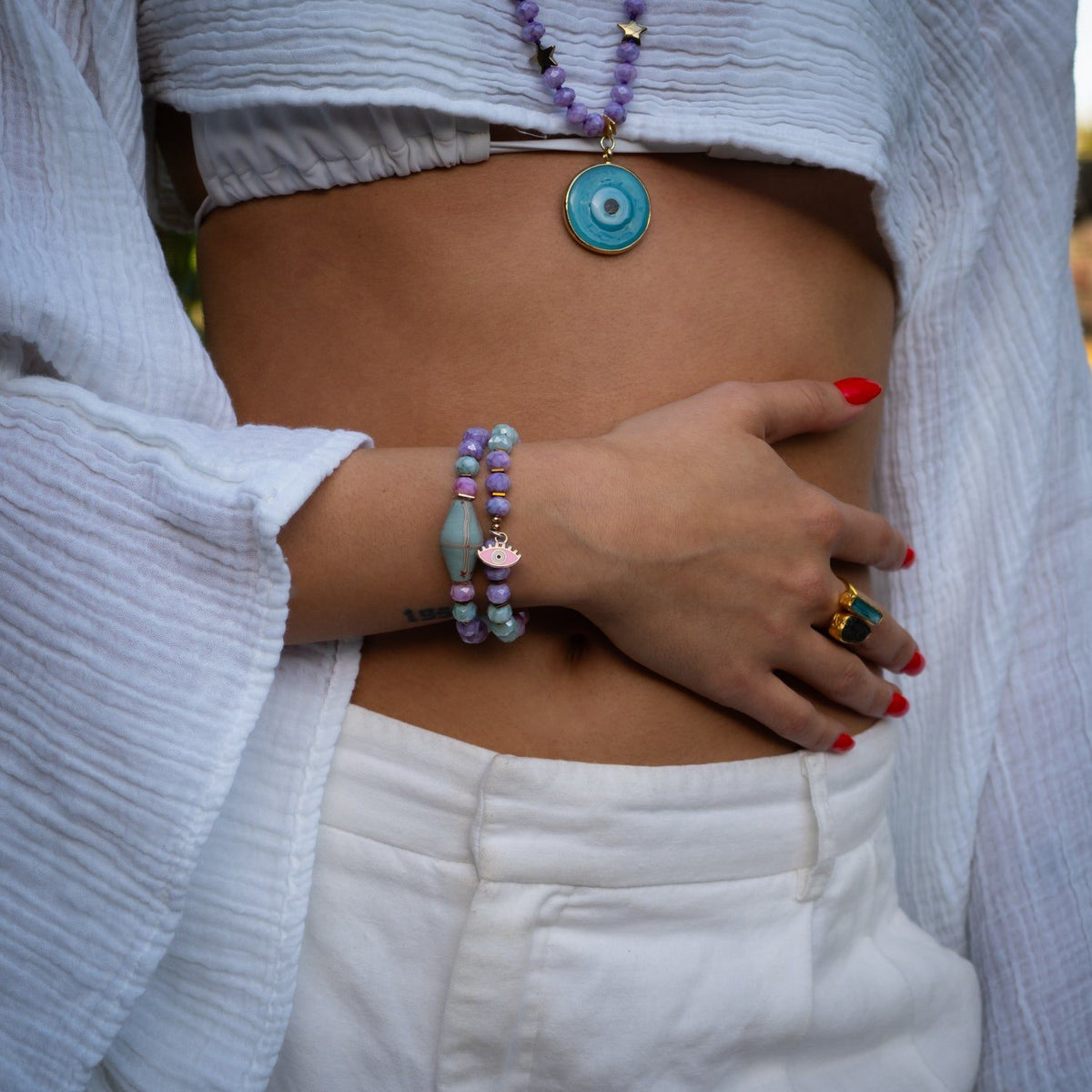 This Pastel Colors Beaded Evil Eye Pendant Spring Bracelet Set by Ebru Jewelry is a vibrant and cheerful set designed to bring positivity and protection to your style. The bracelets feature crystal beads in soft pastel shades, while one is adorned with a pink evil eye charm and the other with a large handmade bead. This set offers a playful and unique charm, perfect for adding a refreshing and stylish touch to your look.