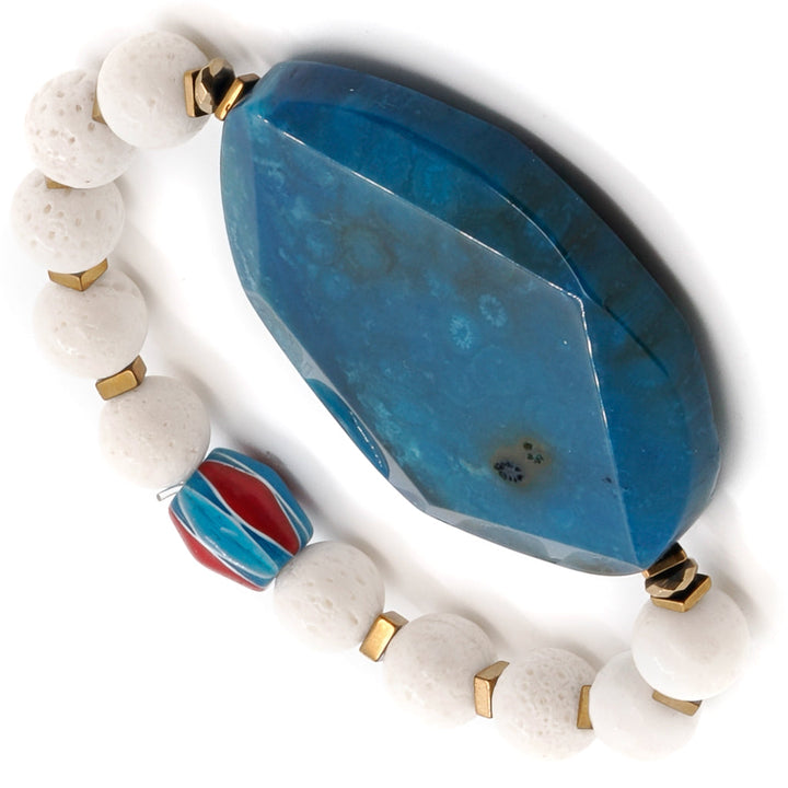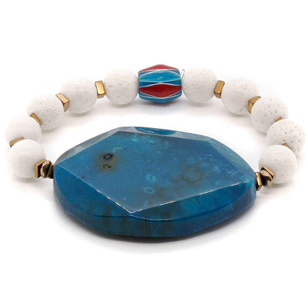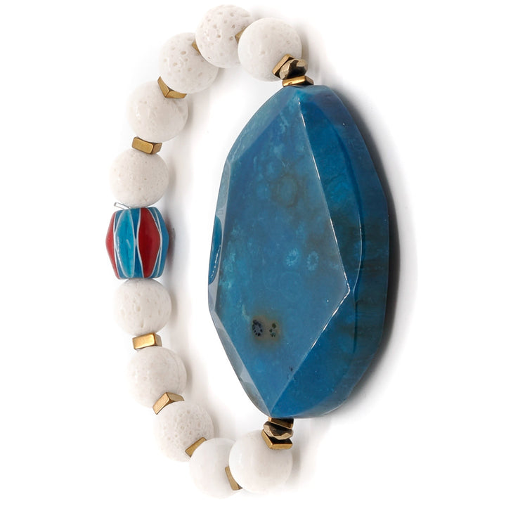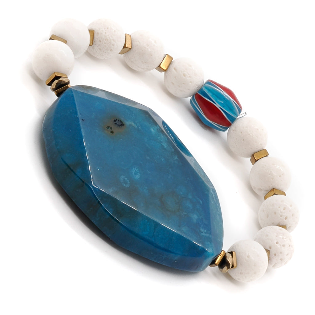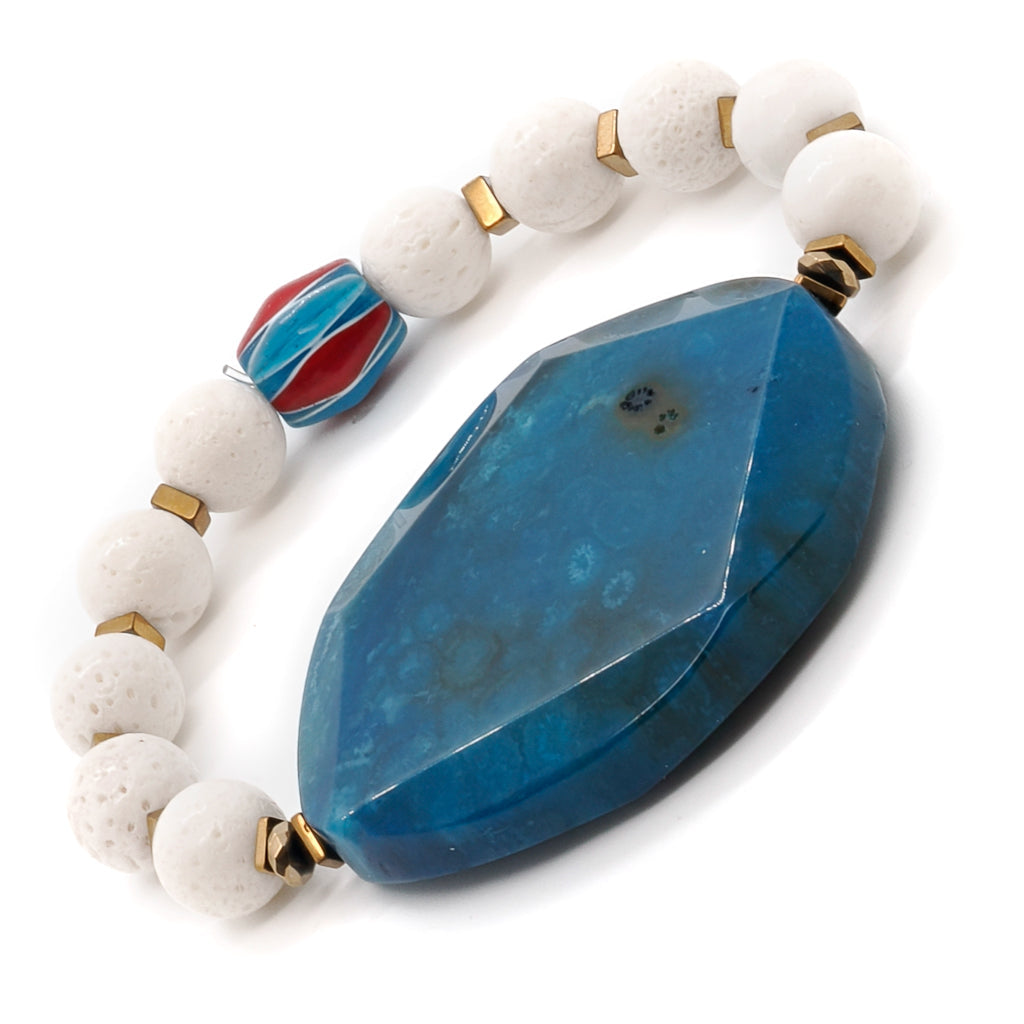 This bracelet is handmade with blue agate gemstones, 10mm white mountain jade stone beads, gold hematite spacers, and African blue and red handmade beads. It has a size of 6.5".