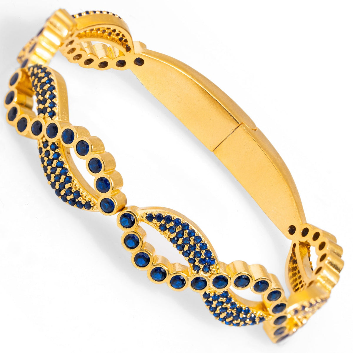This adjustable bangle is crafted with high-quality brass, plated with 24k gold, and features sapphire gemstones.