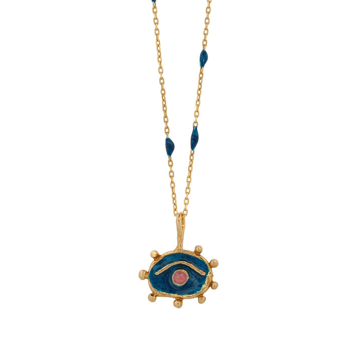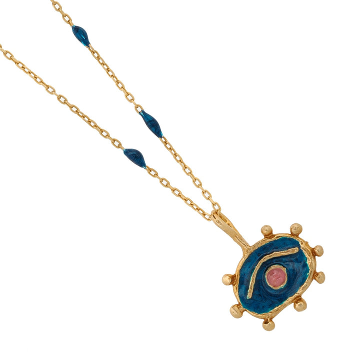This Blue Hittite Sun Pink Tourmaline Statement Necklace by Ebru Jewelry is a striking and symbolic piece. The radiant Hittite Sun pendant, plated in 18k gold on sterling silver, is inspired by ancient symbolism of life and prosperity. The captivating pink tourmaline eye adds a layer of allure, symbolizing protection and intuition, making this necklace not just a beautiful accessory but a powerful talisman.