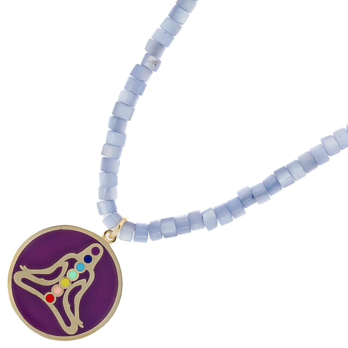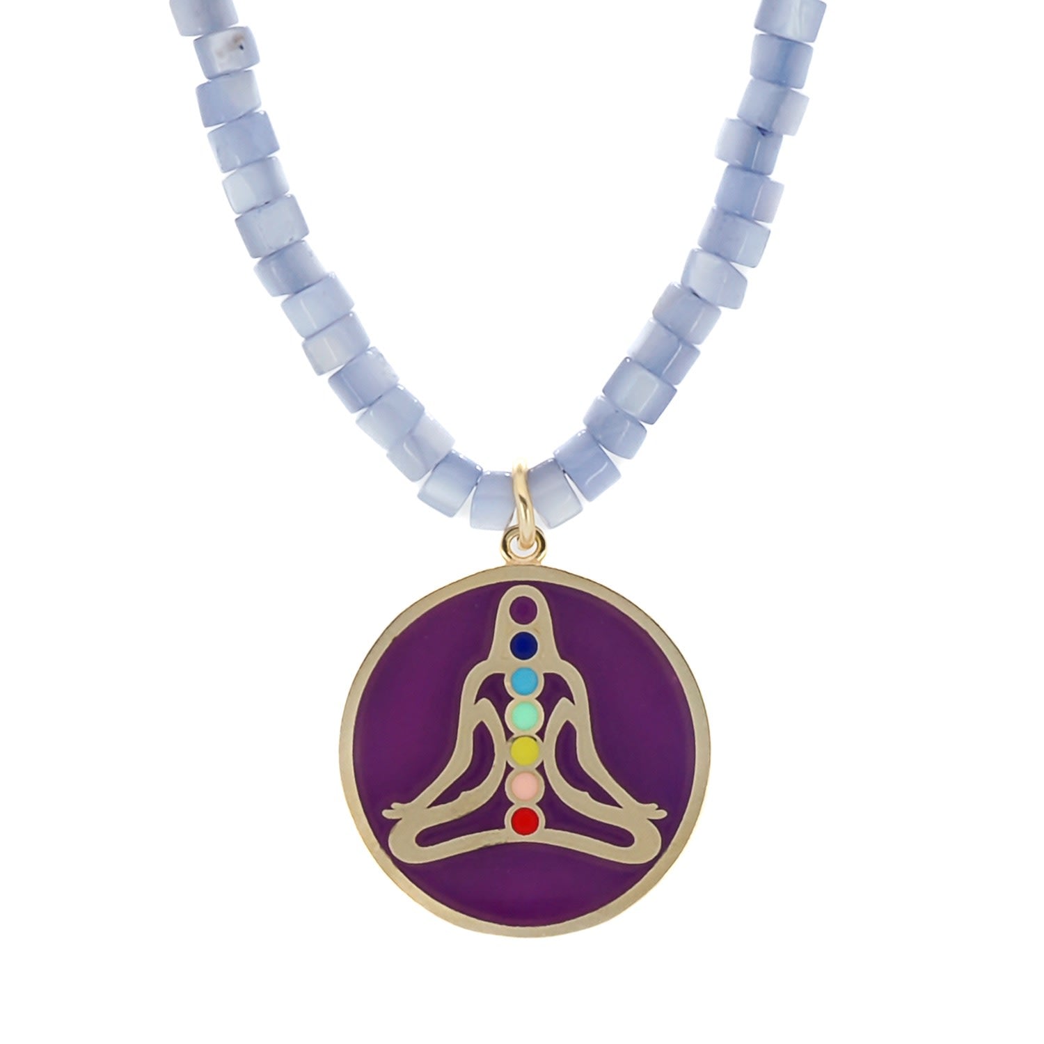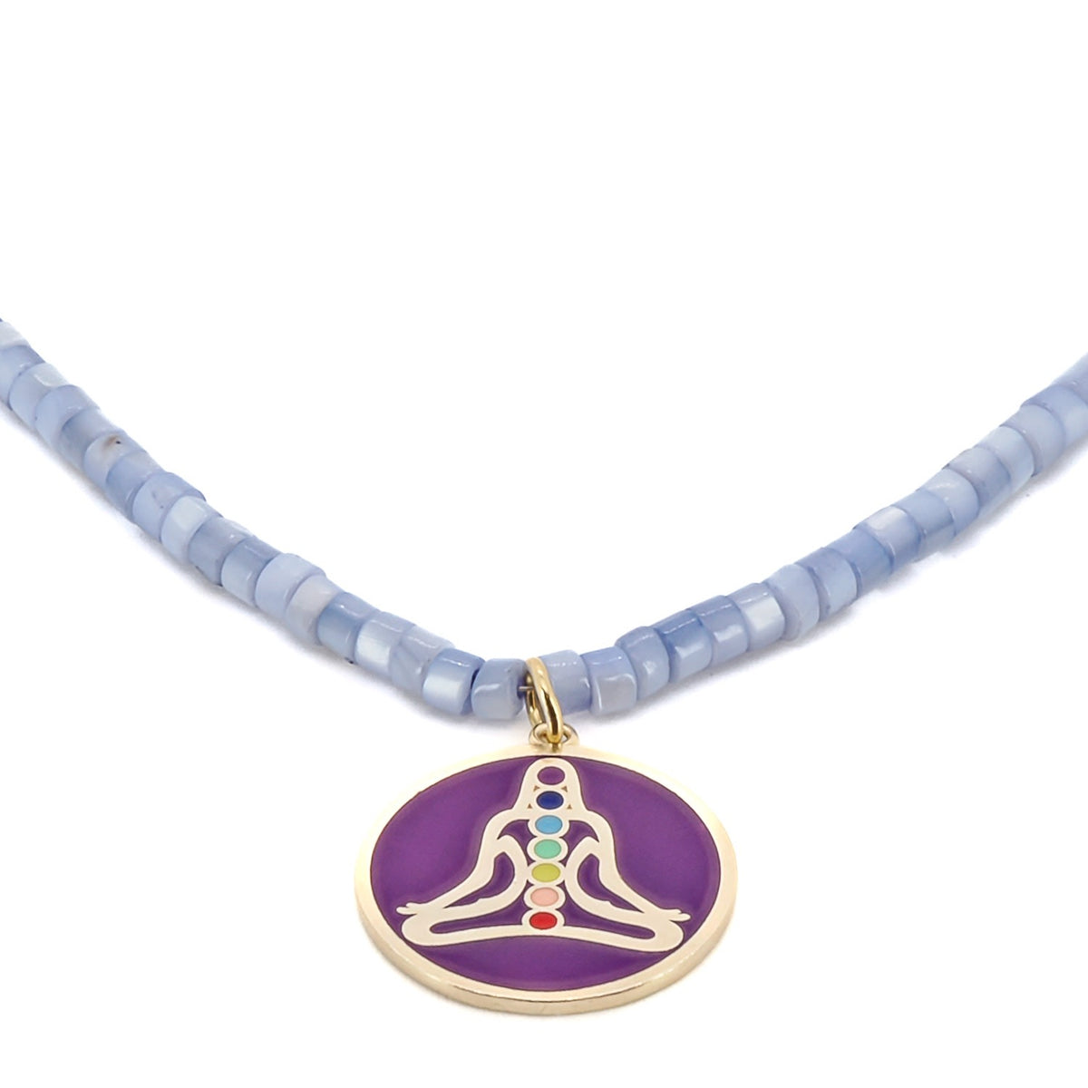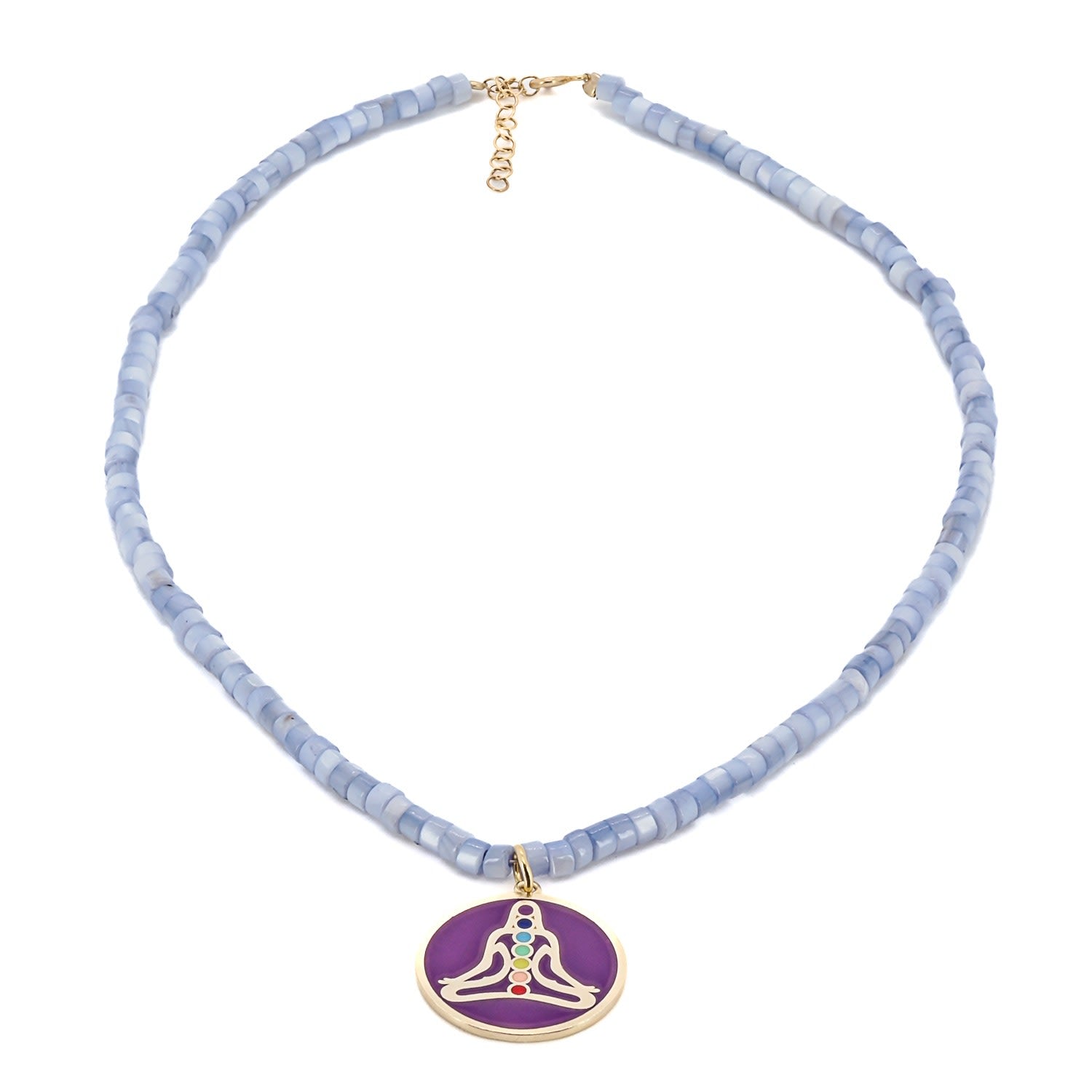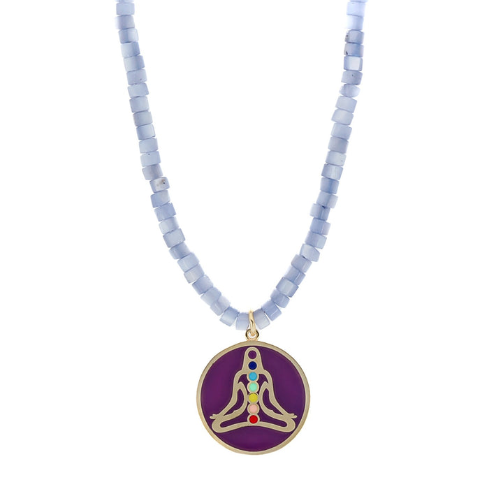 This necklace has an 18k gold-plated and enamel chakra pendant. The beads are lilac pearl stone. The necklace length is 15 inches with a 1.5-inch extender. The pendant is 1 inch high and 1 inch wide.