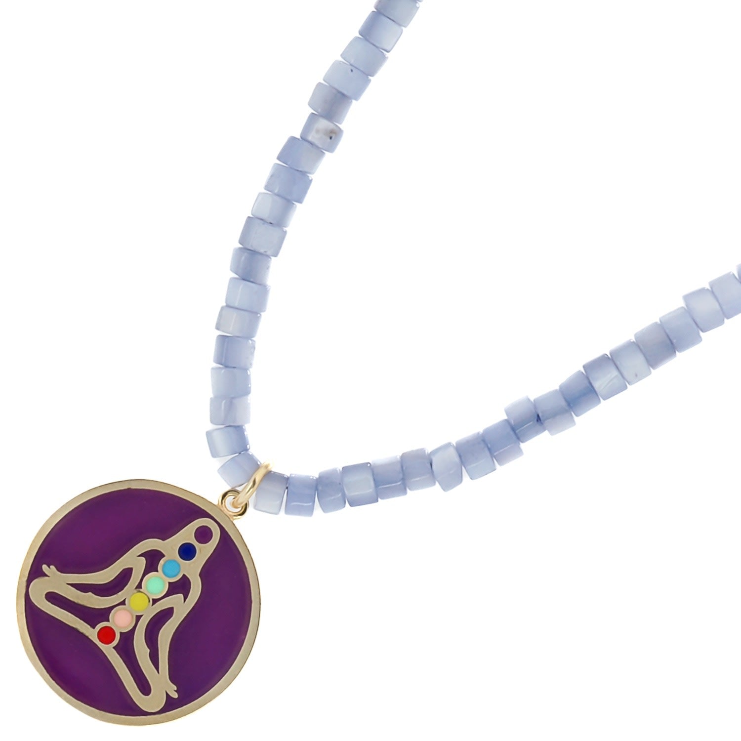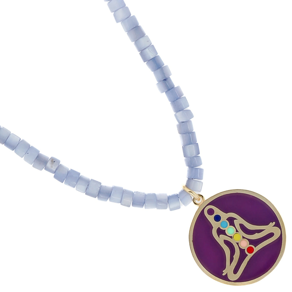 This Purple Chakra Necklace by Ebru Jewelry is a beautiful and meaningful accessory. The necklace features a gold-plated and enamel chakra pendant, with the purple color associated with the crown chakra, representing a connection to the divine. The beads are made of lilac pearl stone, known for its calming properties, creating a harmonious and balanced design that is a stunning addition to any outfit.