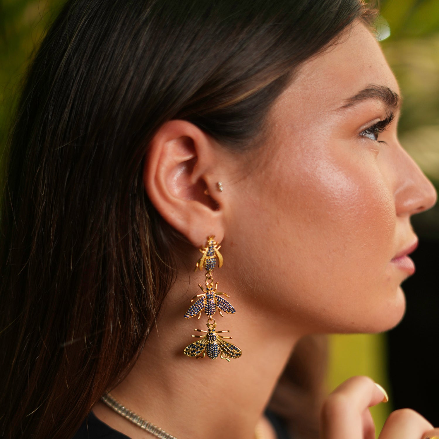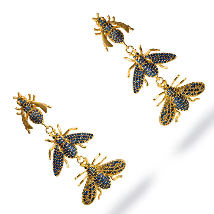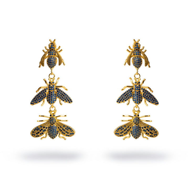 Divine Connection Trio Queen Bee Sapphire & Gold Dangle Earrings - Blue