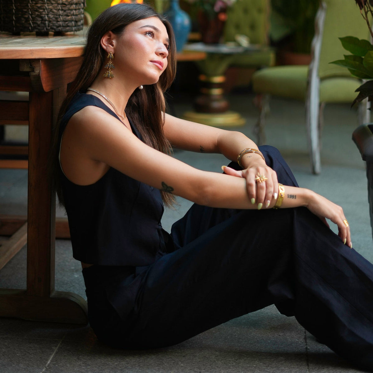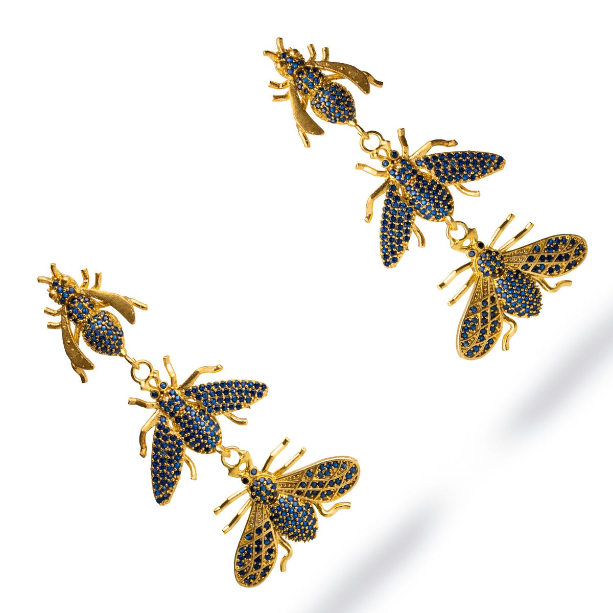 The Divine Connection Trio Queen Bee Sapphire & Gold Dangle Earrings by Ebru Jewelry radiate confidence and power. These stunning earrings feature 24k gold plating and are intricately designed with three descending queen bee motifs, each adorned with dazzling sapphire stones. Their bold, energetic design will leave a lasting impression wherever you go.