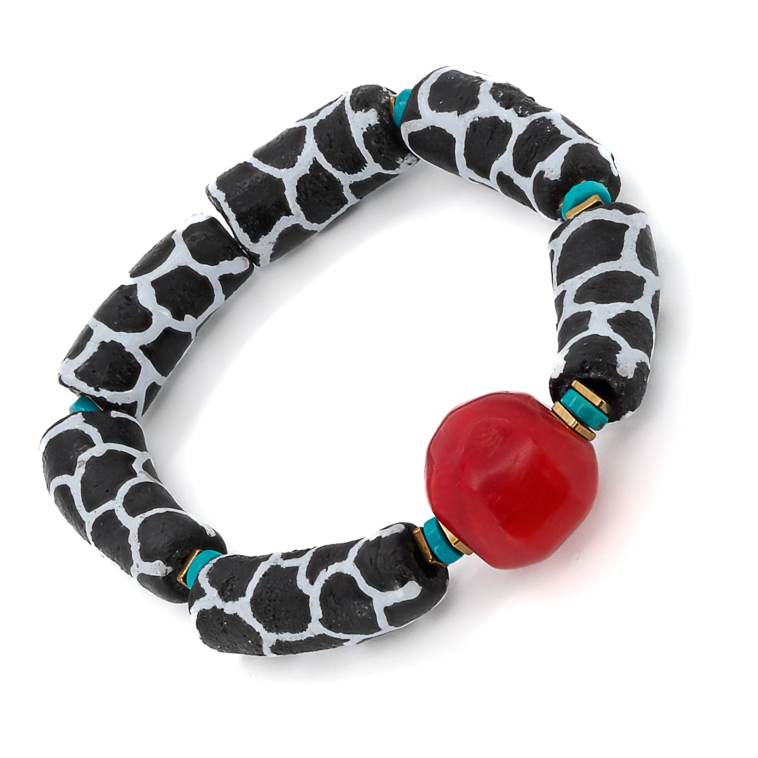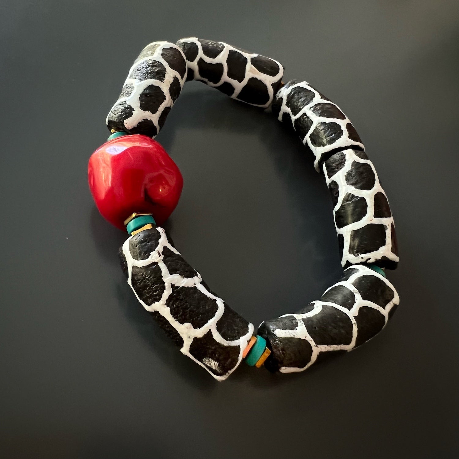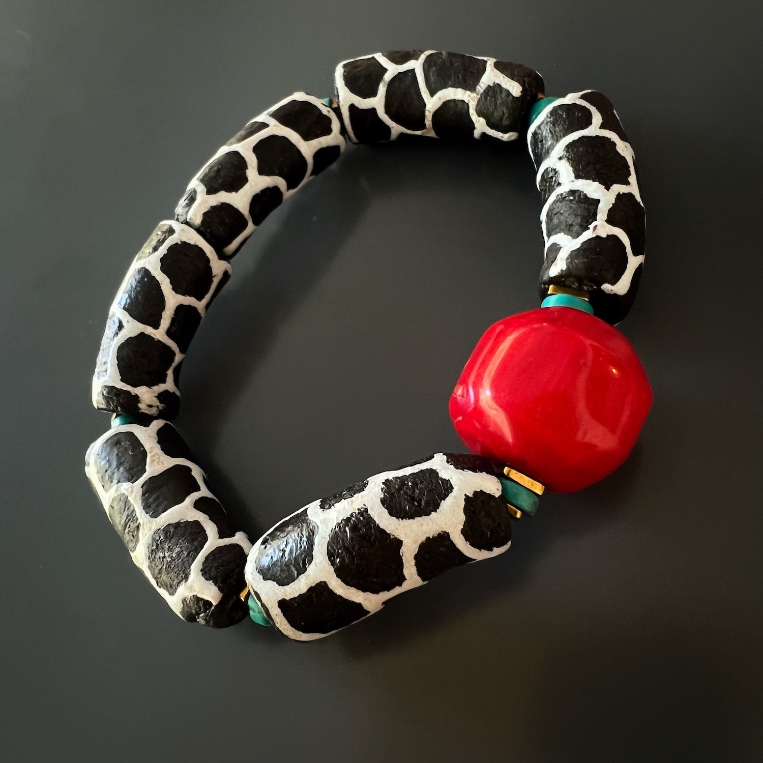 This handmade bracelet features African black and white zebra tube beads, turquoise stones, gold hematite spacers, and a red coral bead. The bracelet size is 6.5 inches.