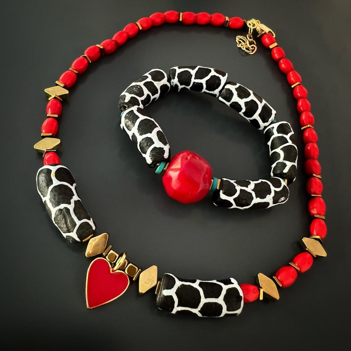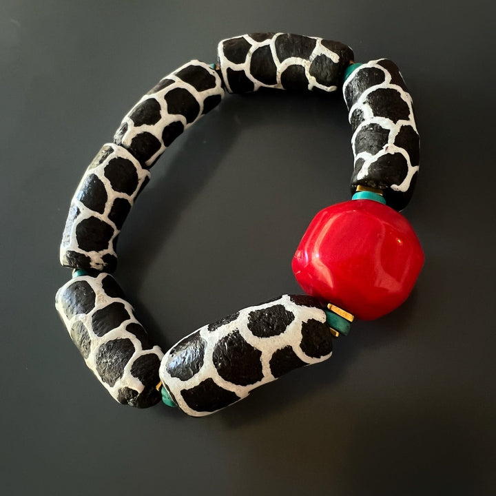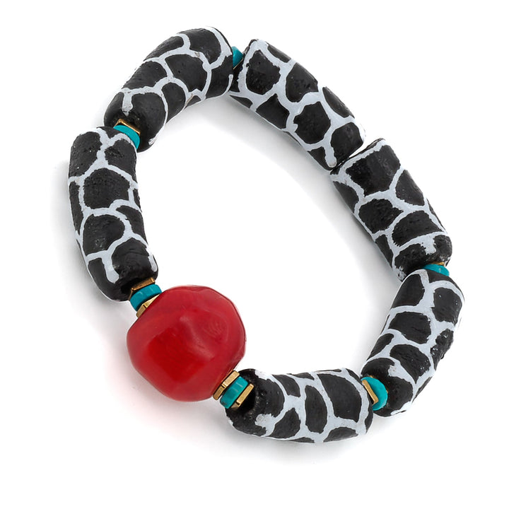 This African Zebra Red Coral Beaded Bracelet by Ebru Jewelry is a striking and captivating handmade accessory. It features African black and white zebra tube beads, turquoise stones, and gold hematite spacers, with a vibrant red coral bead at the center. Red coral is believed to have energizing and protective qualities, making this unique bracelet a beautiful and meaningful statement piece.