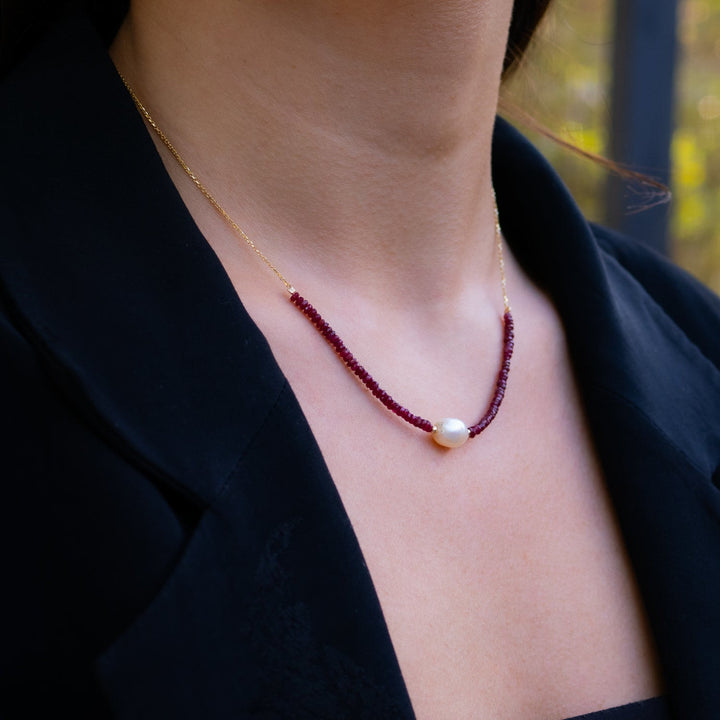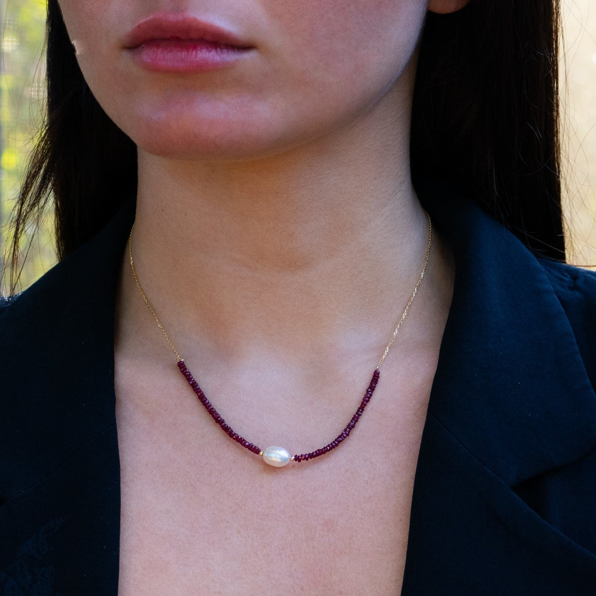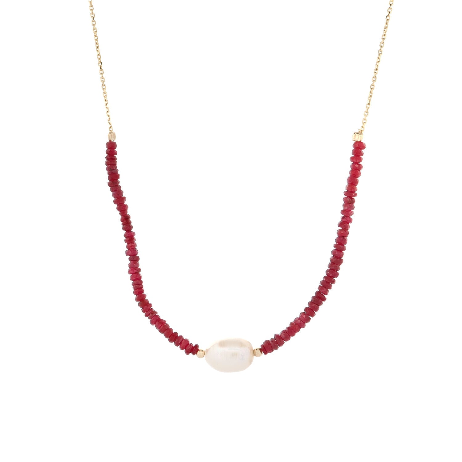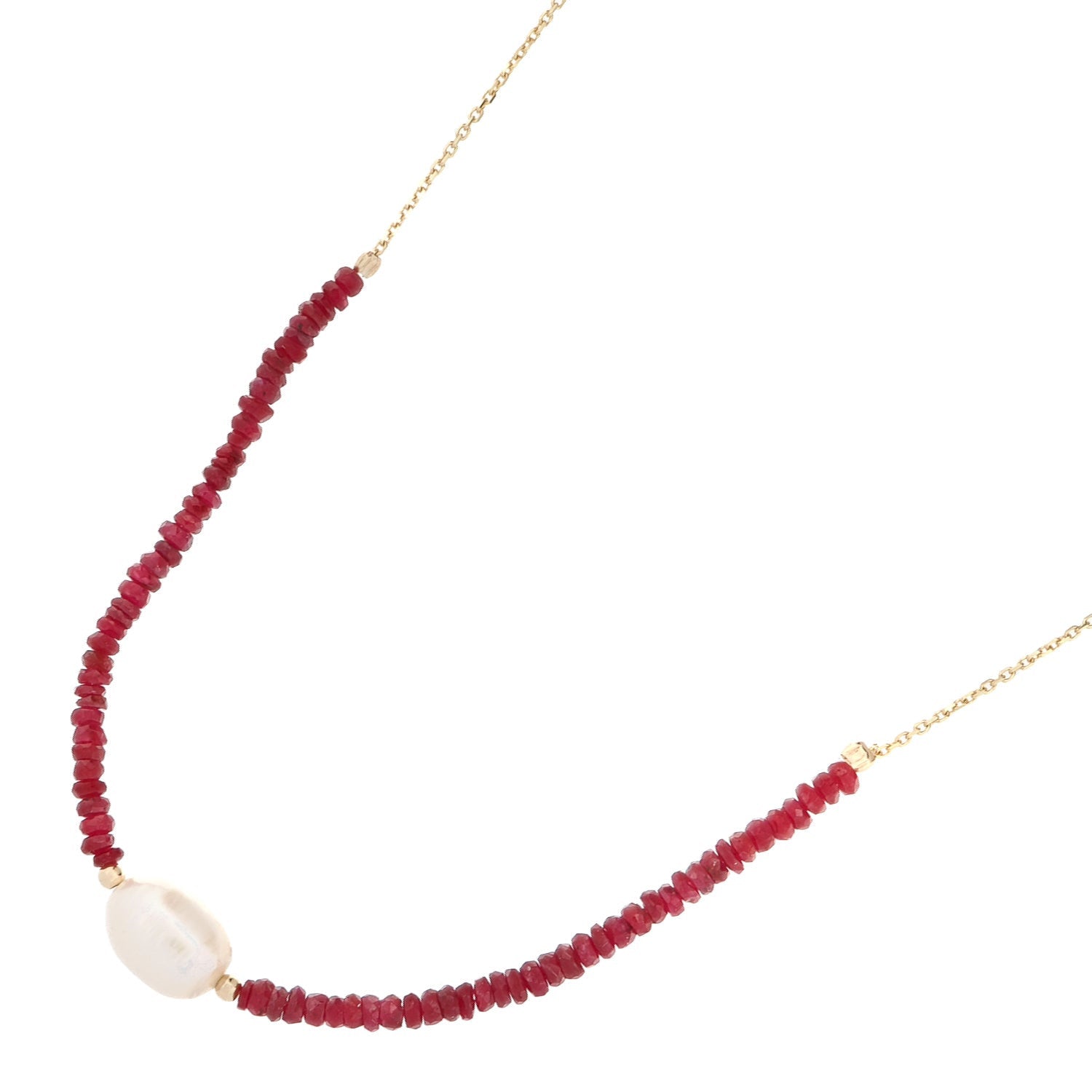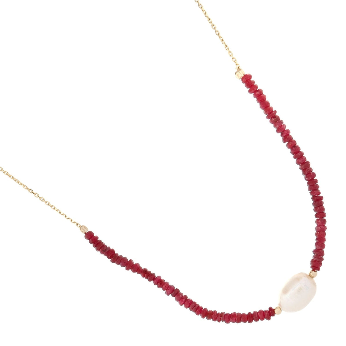 This necklace features a 14K yellow gold chain, a ruby gemstone, and a pearl gemstone. The length is 18 inches.