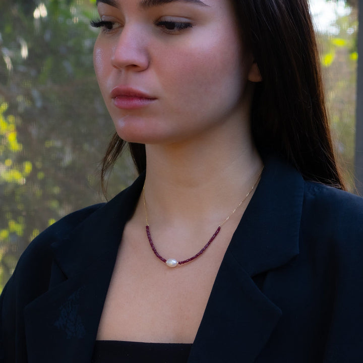 The Ruby Elegance Pearl Choker Gold Necklace by Ebru Jewelry exudes timeless sophistication. This necklace features a stunning ruby and a pearl at its center, with the design completed by a 14K solid gold chain. The ruby symbolizes love and passion, and the pearl symbolizes purity, making this piece both luxurious and meaningful.