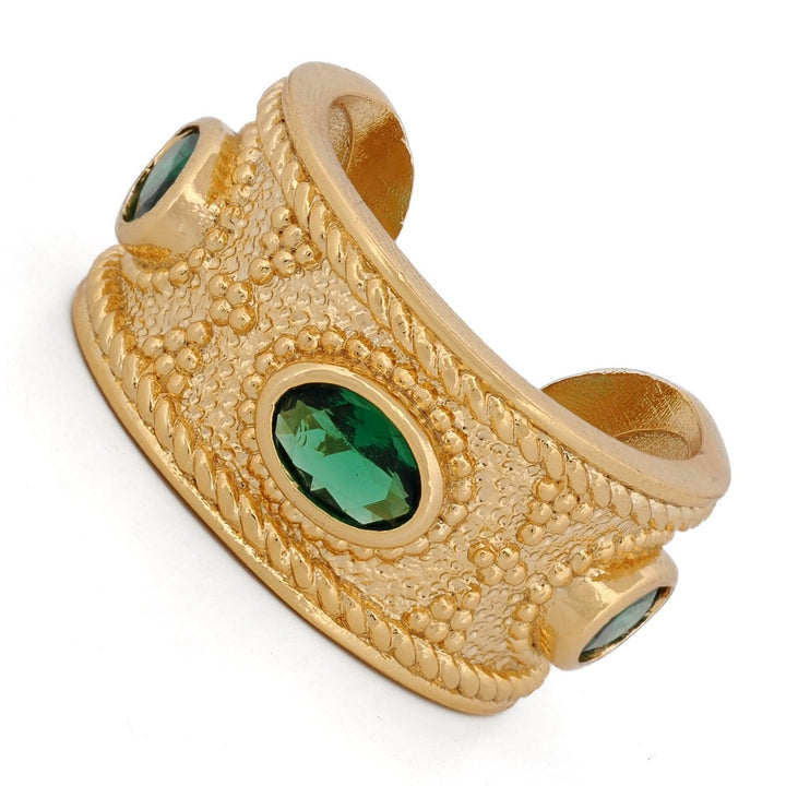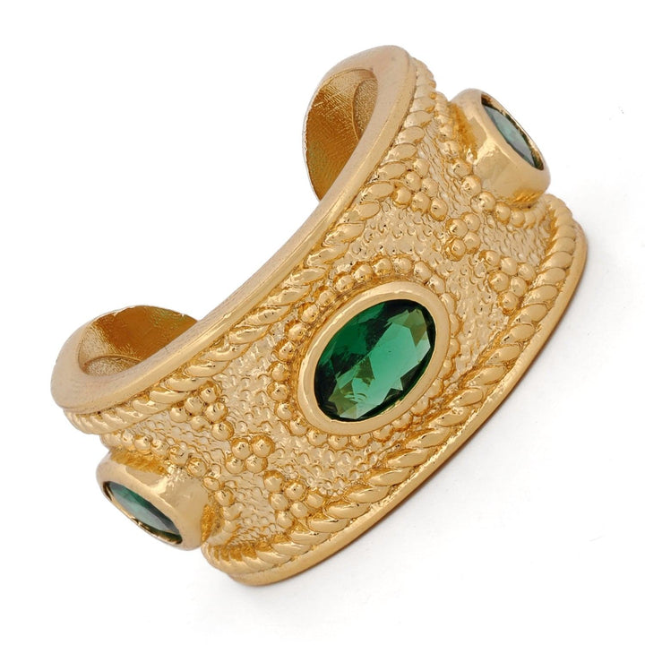 This ring is crafted on a bronze base with 24K gold plating. It features three emerald stones and has an adjustable cuff design.