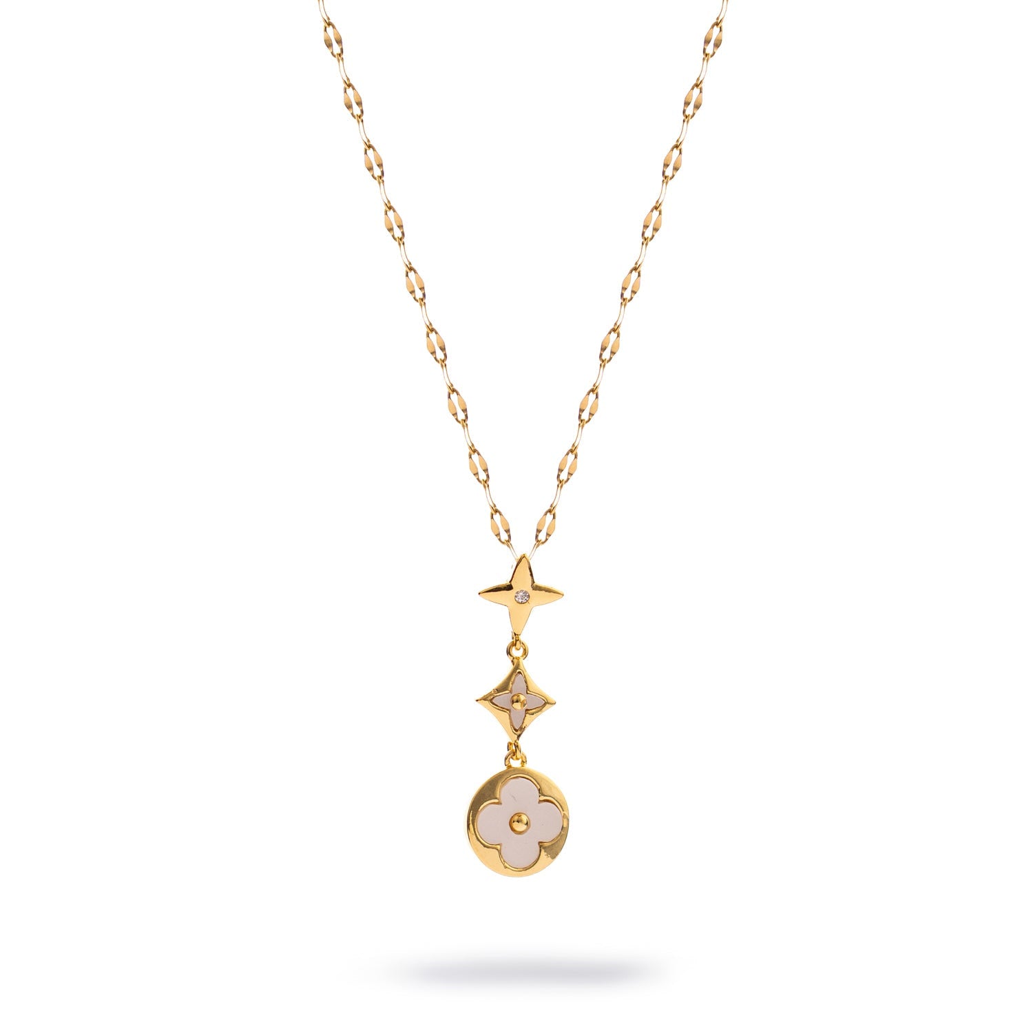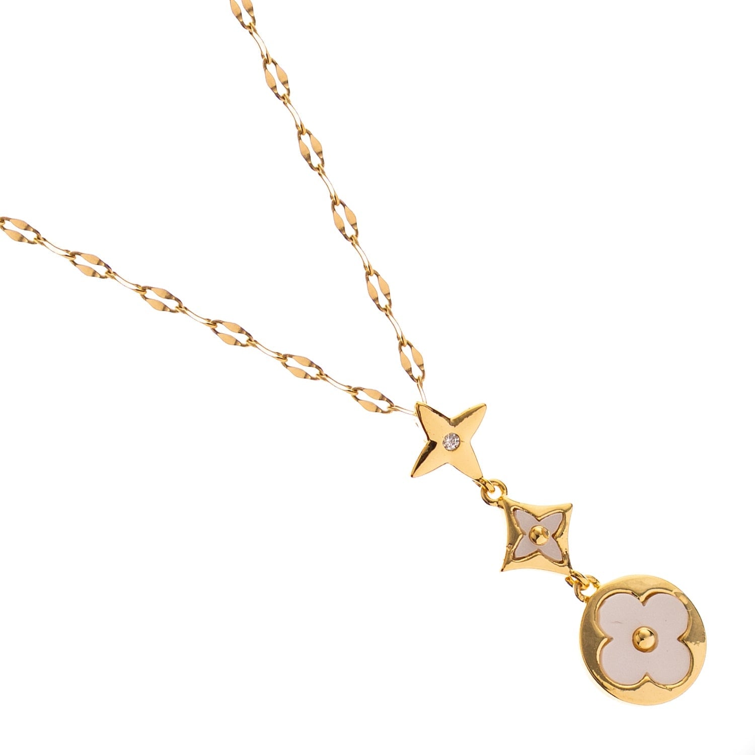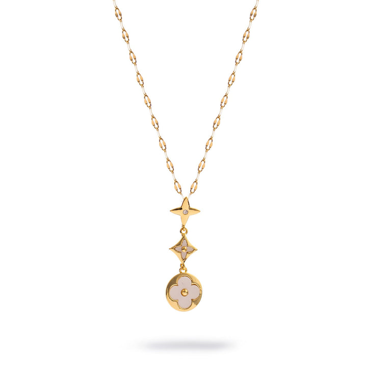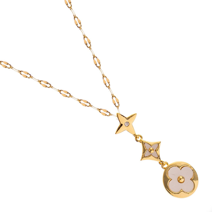 This necklace is made of water-resistant stainless steel with gold plating. It features a star, a starburst, and a blossom charm. The necklace is 15 inches long with a 2-inch extender. The pendant is 2 inches high and 0.4 inches wide.