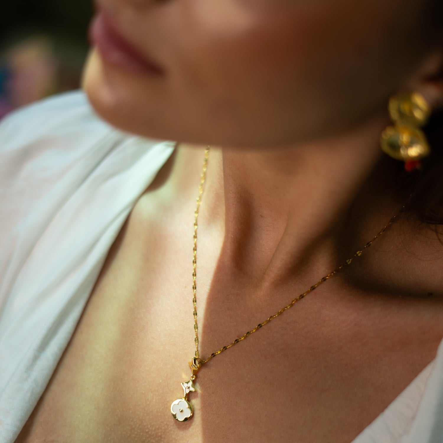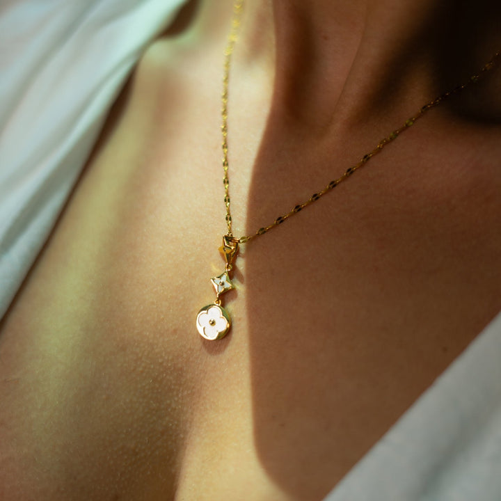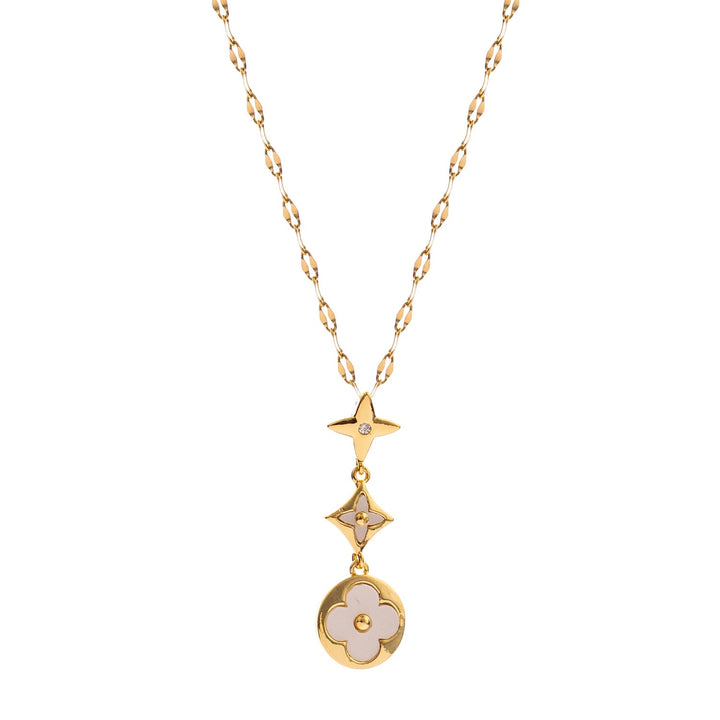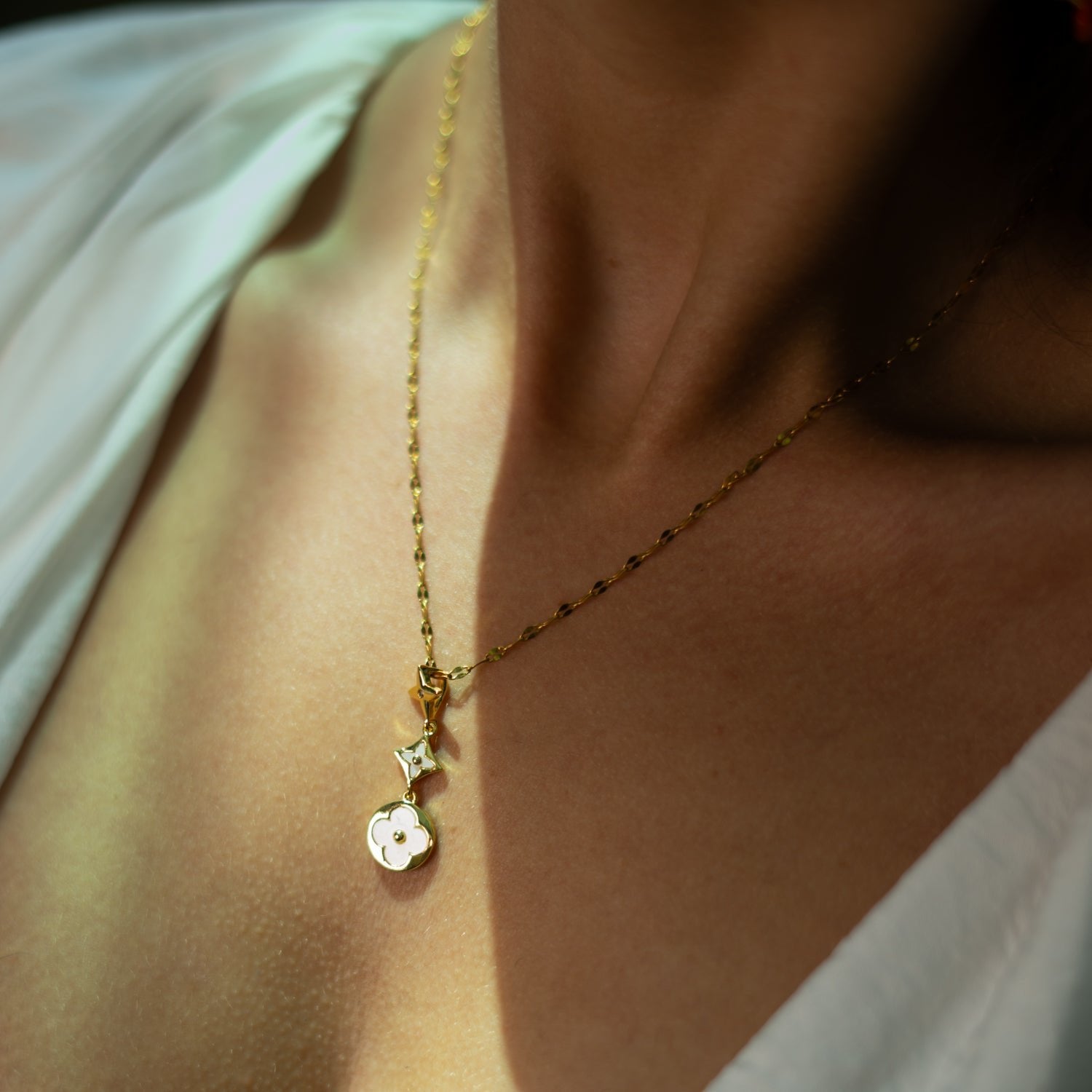 This necklace is made of water-resistant stainless steel with gold plating. It features a star, a starburst, and a blossom charm. The necklace is 15 inches long with a 2-inch extender. The pendant is 2 inches high and 0.4 inches wide.