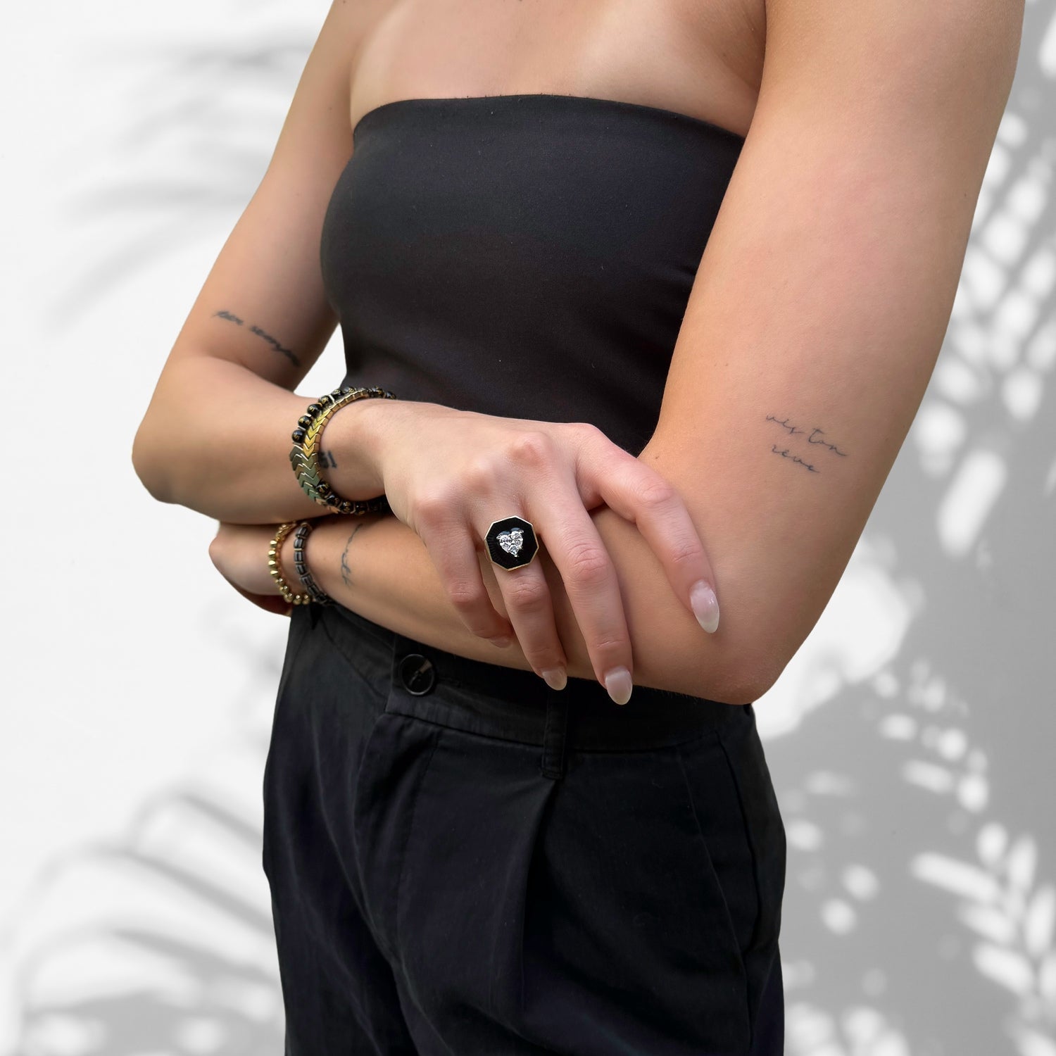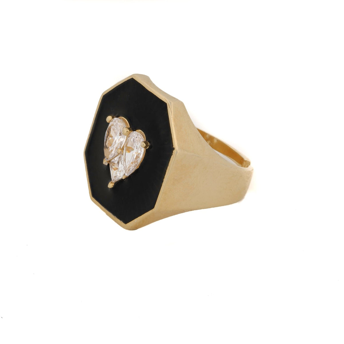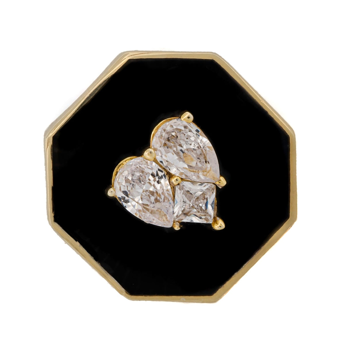 The Magical Love Black Enamel Diamond Heart Adjustable Statement Ring by Ebru Jewelry is a masterpiece of love and elegance. This adjustable ring features a luxurious 14k gold plating over sterling silver. A radiant, heart-shaped Cubic Zirconia diamond is embraced by vibrant black enamel, making it a perfect gift for any special occasion.