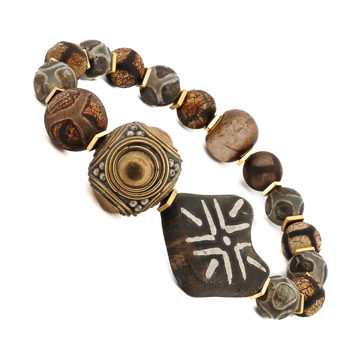 This bracelet features 8mm Nepal agate beads, a gold-plated Nepal handmade large bead, handmade large beads with geometric designs, and gold hematite spacers. The bracelet size is 6.5 inches.