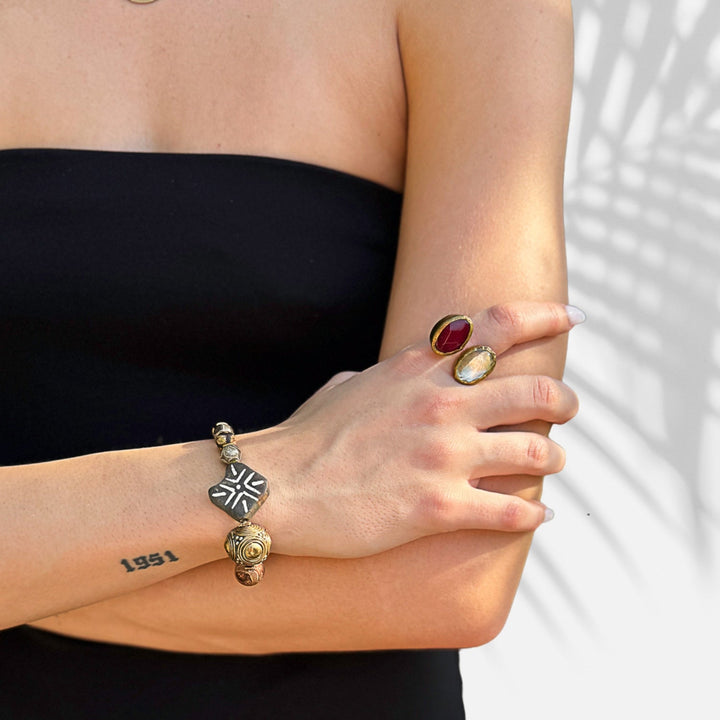 The Nepal Agate Nature Beaded Bracelet by Ebru Jewelry is a harmonious accessory that celebrates nature and style. This bracelet features Nepal agate stone beads, handmade nature-inspired beads with geometric symbols, and gold hematite spacers. The combination of these unique elements creates a visually striking and meaningful piece.