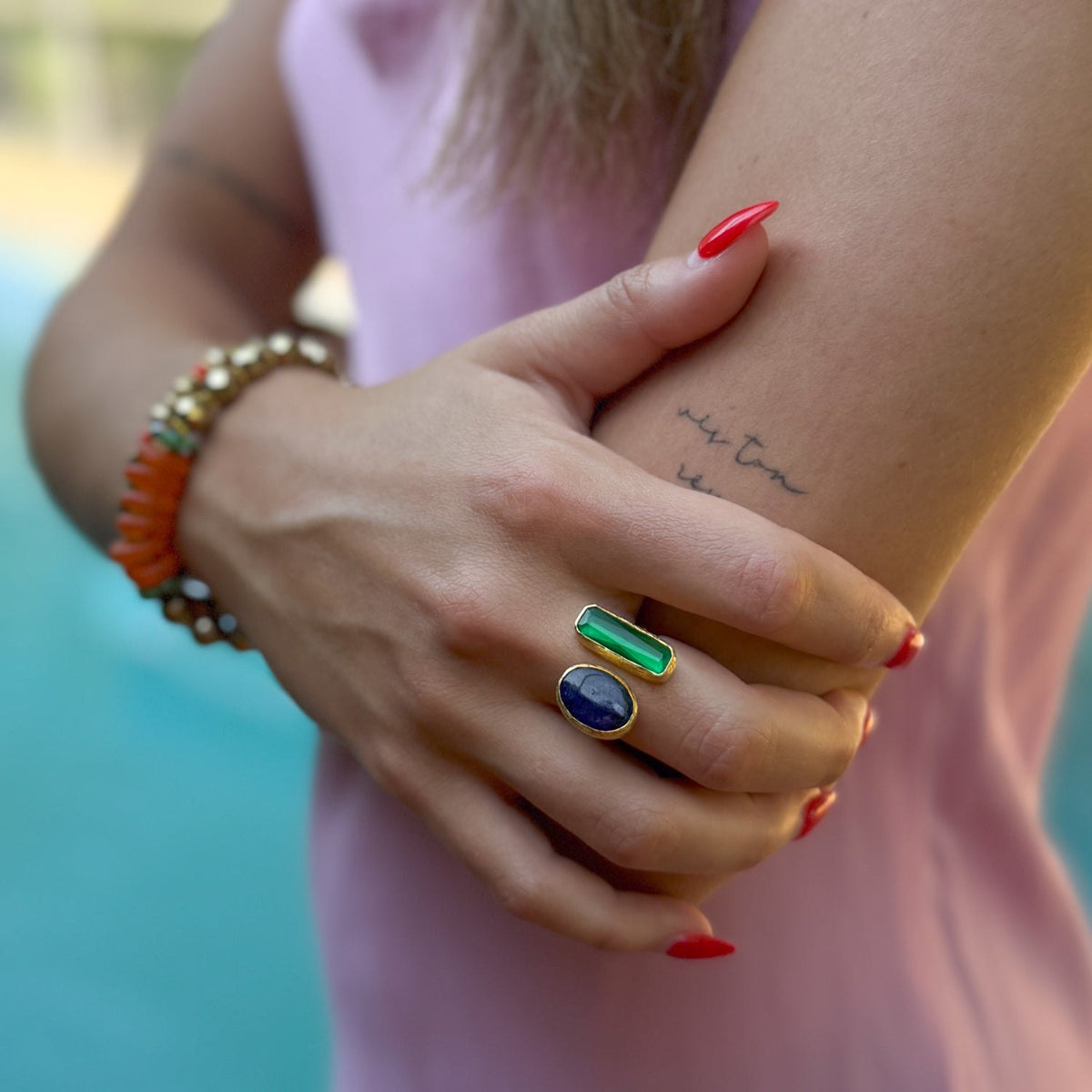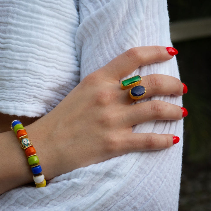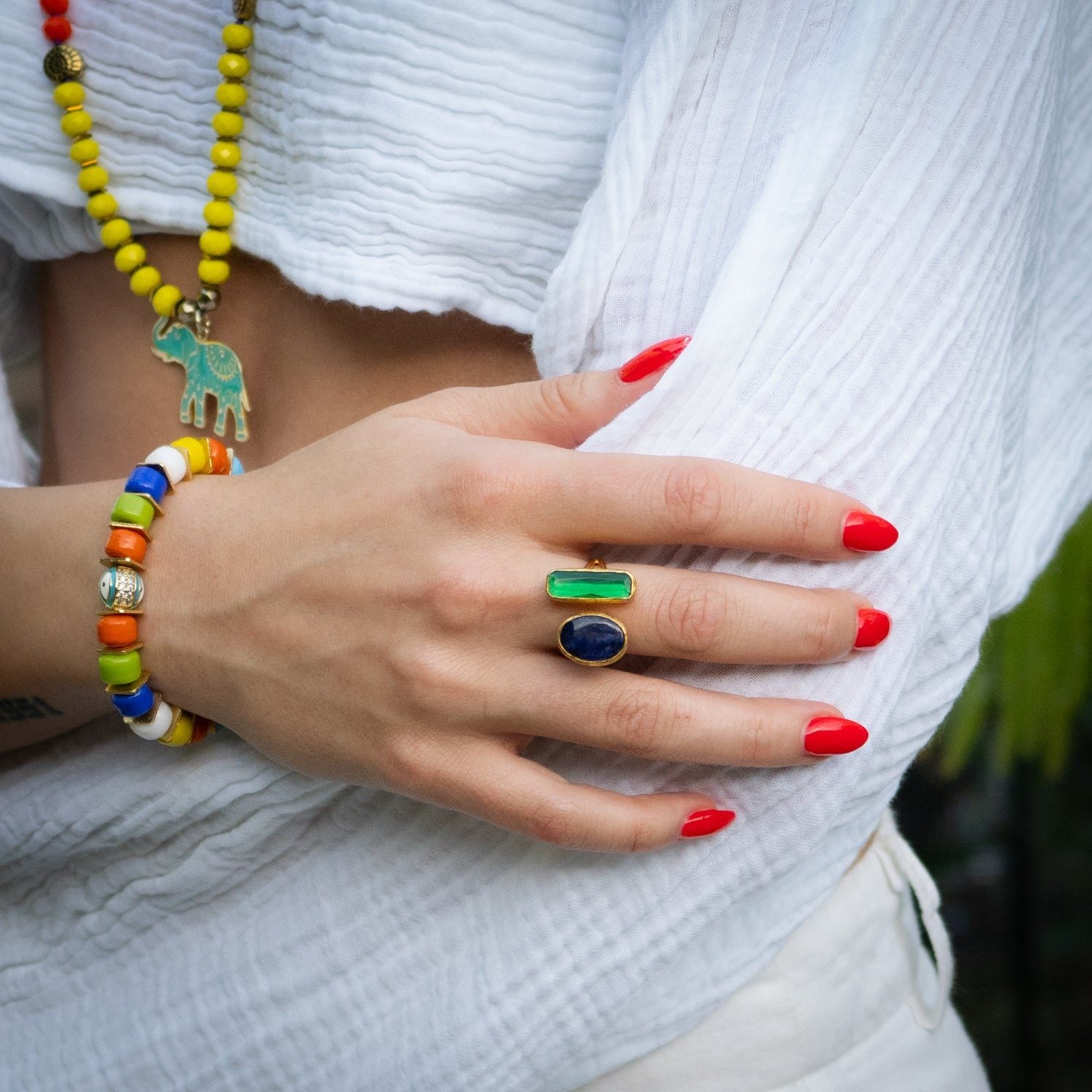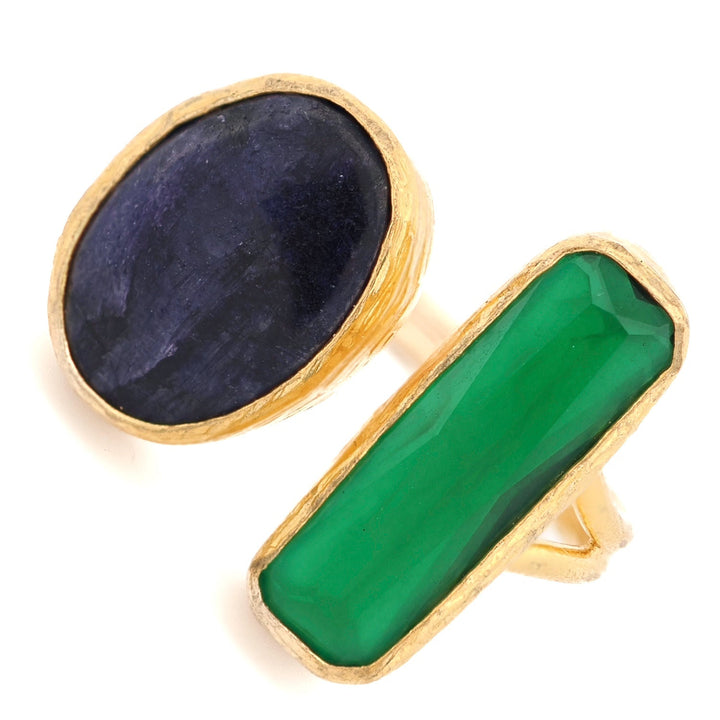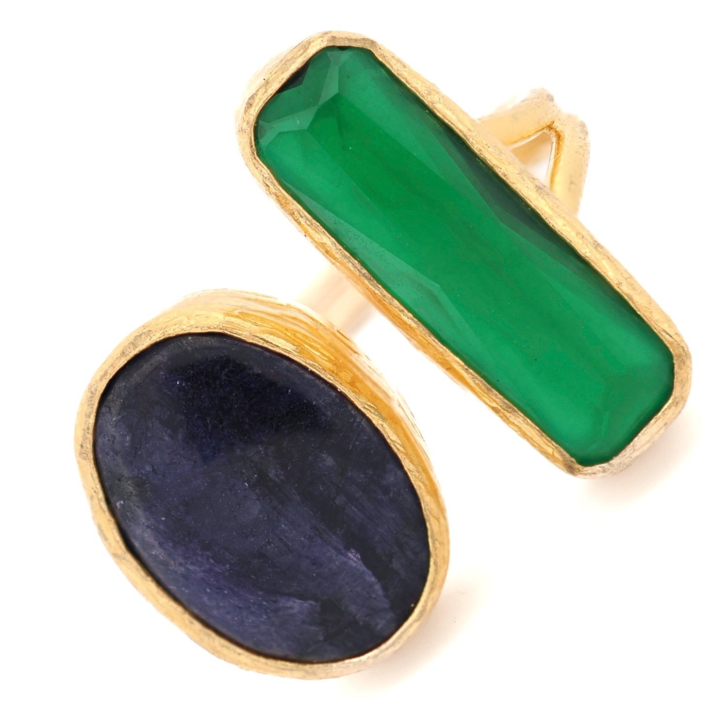 This Spirit Garden Green Enamel & Amethyst Adjustable Gemstone Ring by Ebru Jewelry is a unique, one-of-a-kind piece. It features a vibrant green enamel stone paired with a raw amethyst gem, symbolizing growth, intuition, and spiritual harmony. The ring's asymmetrical silhouette and 24K gold-plated bronze band create a modern and bold look, celebrating the contrast between the lush green and deep violet hues.