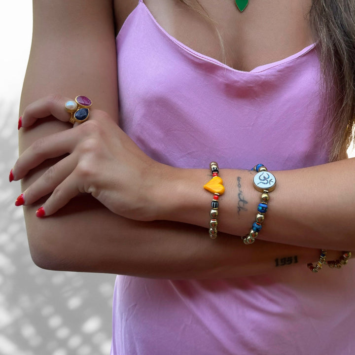 This Om Mantra Meditation & Gold Beaded Bracelet by Ebru Jewelry is a meaningful and uplifting piece designed for spiritual connection. Centered around a handcrafted Om bead—a symbol of universal harmony and inner peace—this bracelet serves as a constant reminder of mindfulness. The radiant gold hematite stones, known for their grounding and protective properties, enhance this sense of balance and security. This is a thoughtful accessory for anyone seeking a blend of elegance and spiritual energy.