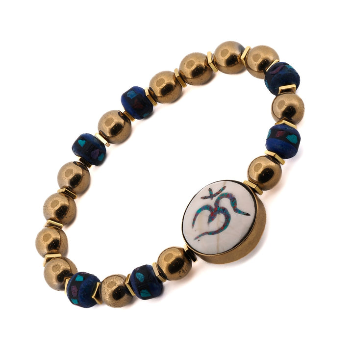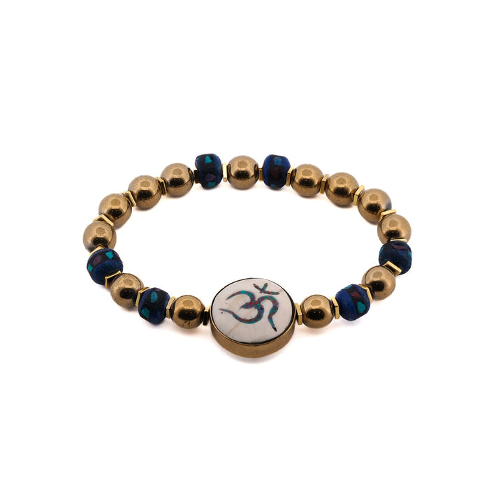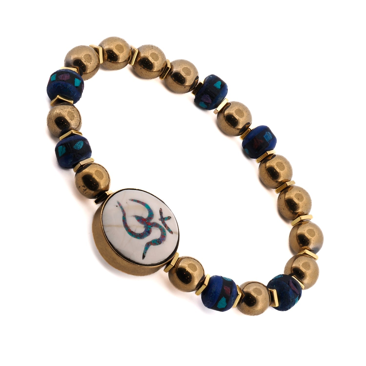 This bracelet features gold hematite stone beads, blue meditation beads, and a Nepal Om mantra bead. The bracelet size is 6.5 inches.