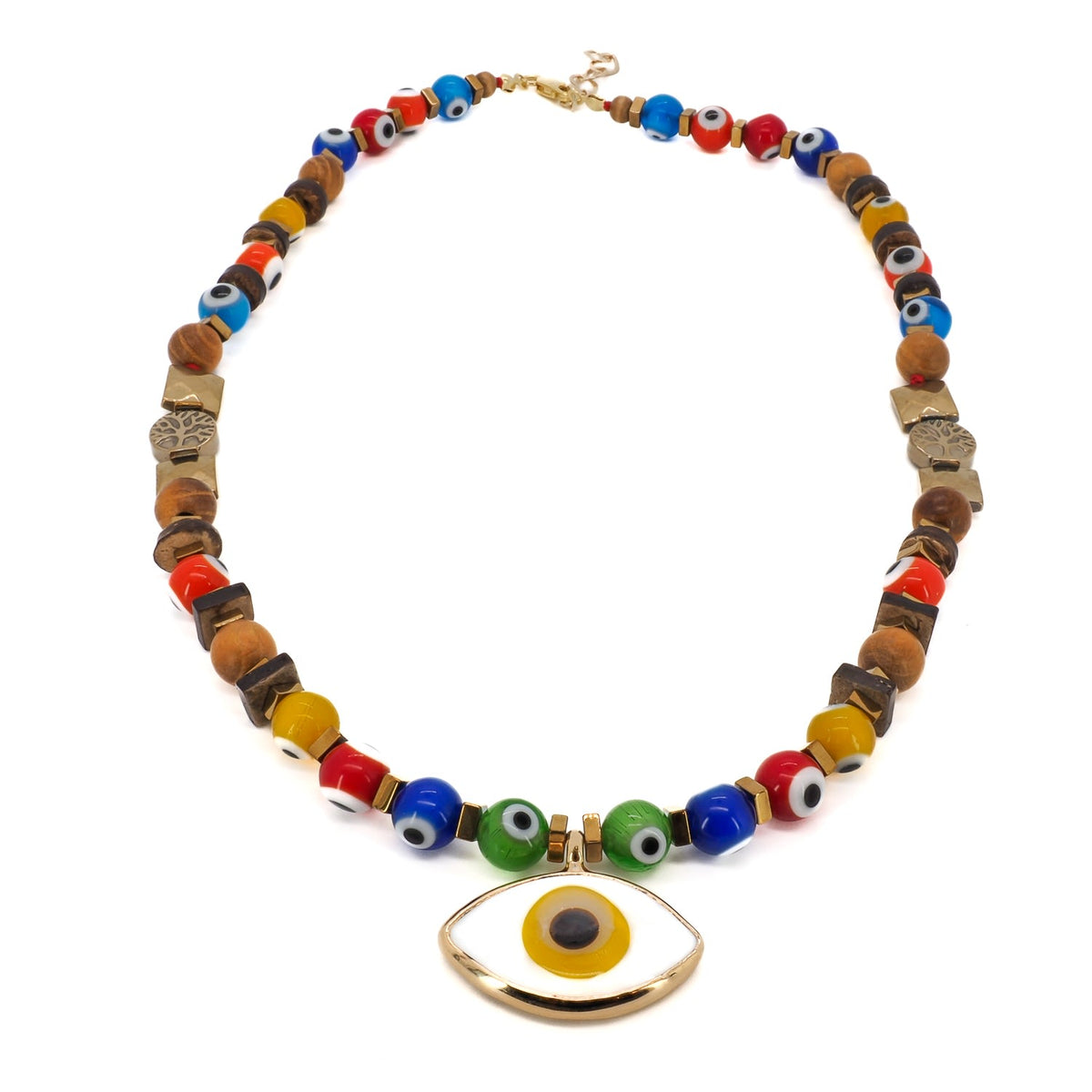 This necklace features a mix of glass evil eye beads in blue, yellow, red, and green. It also includes gold hematite stone beads and a gold-plated yellow glass evil eye pendant. The necklace length is 20 inches, and the pendant measures 0.6" high by 1" wide.