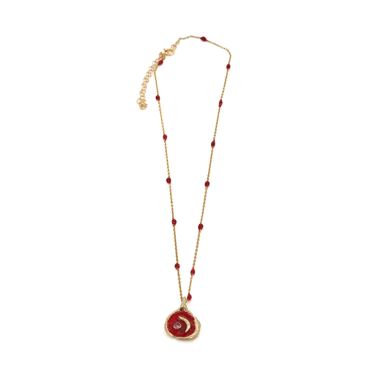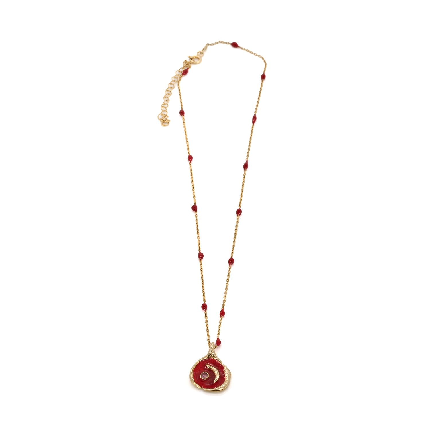 Red Moon Pendant Gold & Enamel Chain Necklace - Red