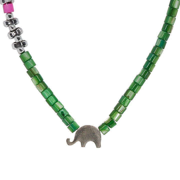 This choker necklace is made of green pearl stone beads, silver hematite stone spacers, and a 925 sterling silver elephant charm. It has a length of 16 inches.