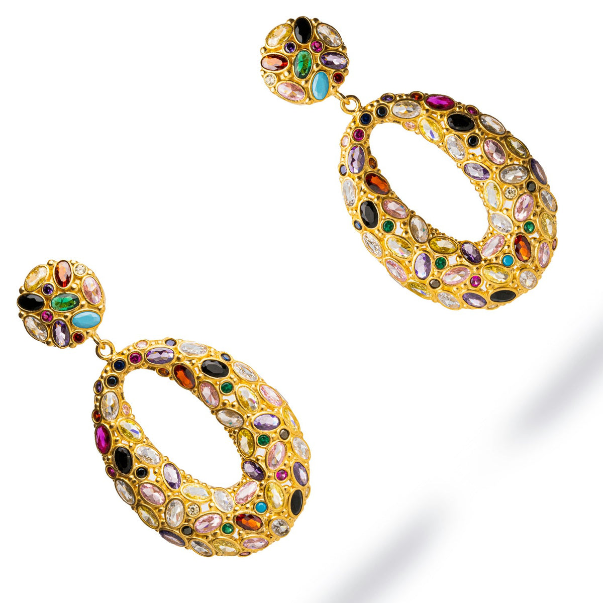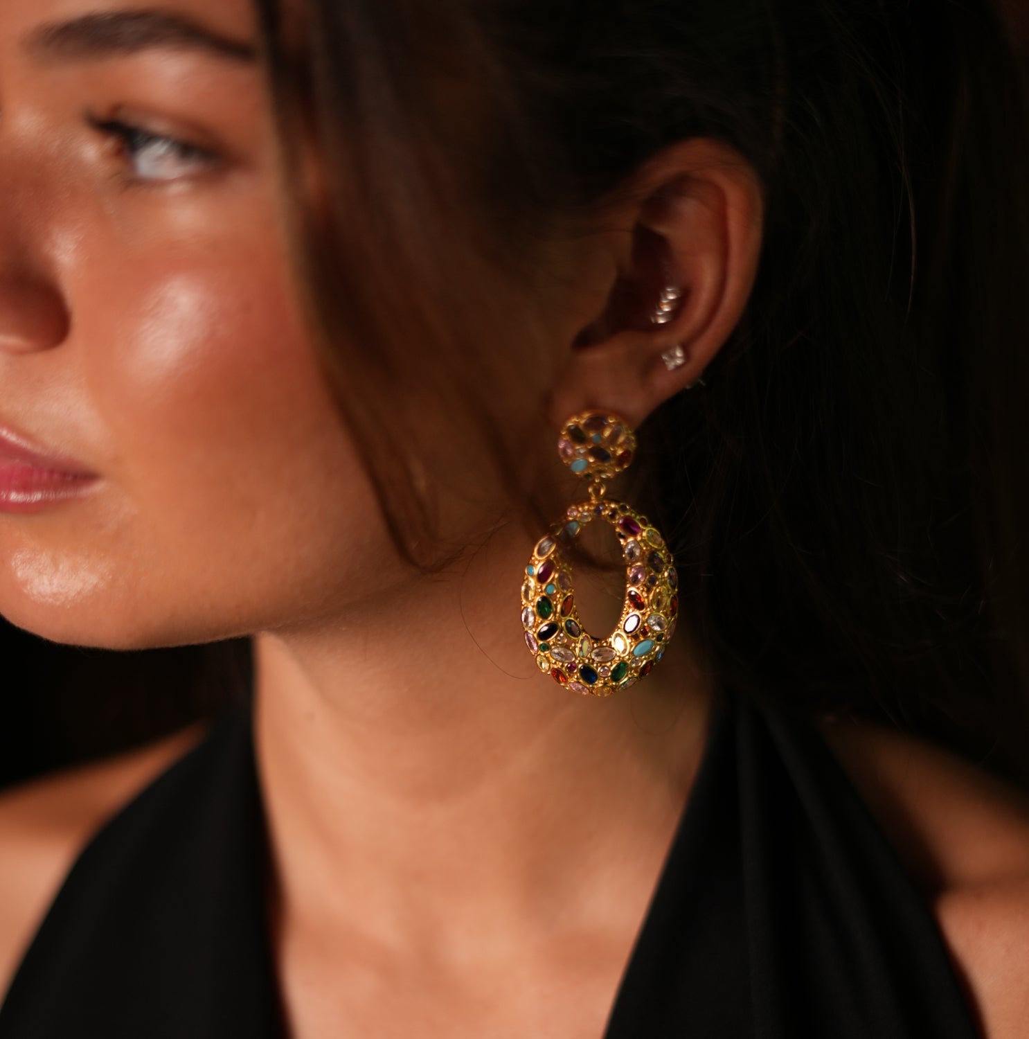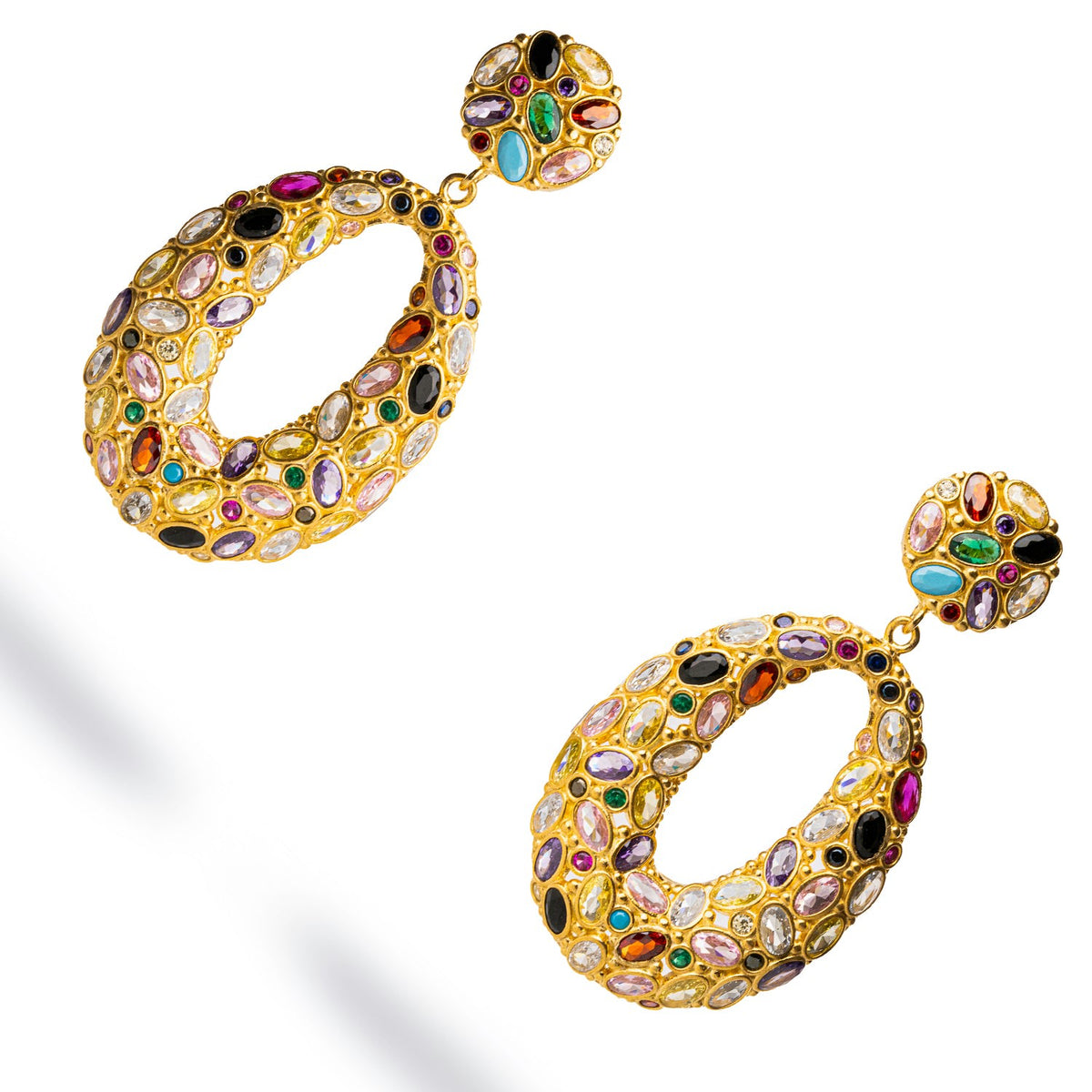 These dangle earrings are made from brass plated with 24k gold. They are set with sapphire, turquoise, and ruby gemstones. They have a length of 2 inches and a width of 1.2 inches.