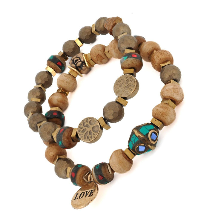 This bracelet set includes a bracelet with a turquoise inlay Nepal bead and a bronze "Love" charm, and a second bracelet with faceted gold hematite stones, a Tree of Life bead, and a Buddha bead. The size is 6.5 inches.