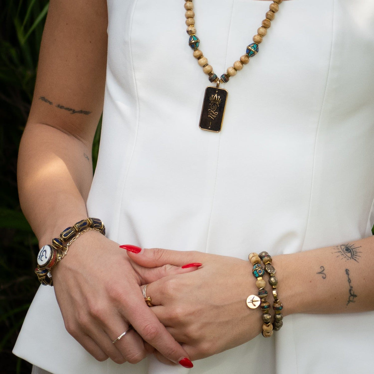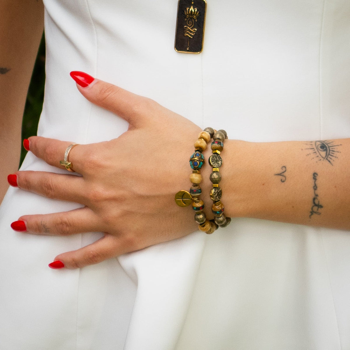 The Boho Soul Nepal Meditation & Buddha Bead Bracelet Set by Ebru Jewelry is a handcrafted duo that fuses ancient symbolism with modern bohemian spirit. The set includes a bracelet with a bronze "Love" charm and a turquoise inlay Nepal meditation bead, and a second bracelet with faceted gold hematite stones, a Tree of Life, and Buddha beads. It's a perfect set for balance and protection.