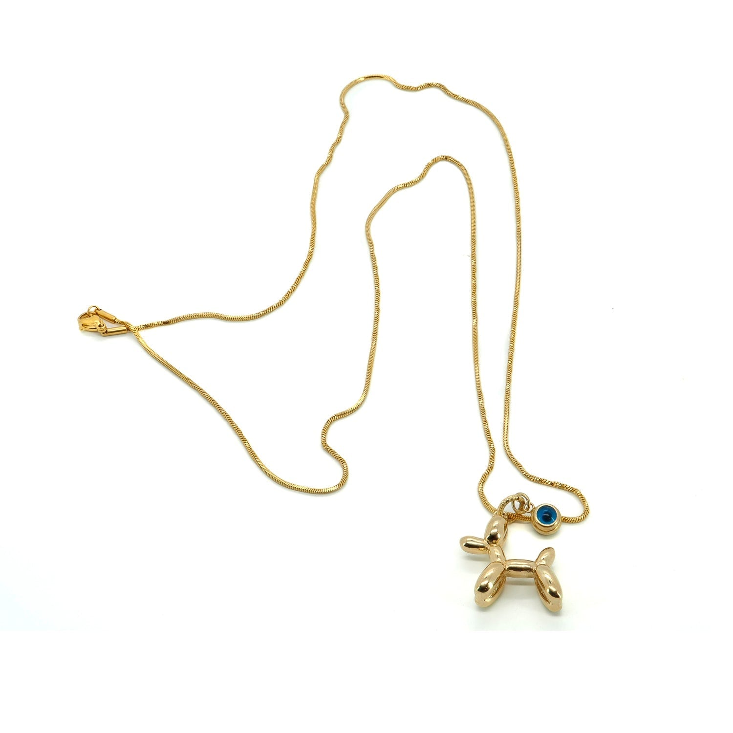 This long necklace is made with an 18K gold-plated balloon dog pendant, a gold-plated sterling silver evil eye charm, and a 30-inch gold-plated steel chain. The pendant height is 1 inch, and the width is 0.8 inches.