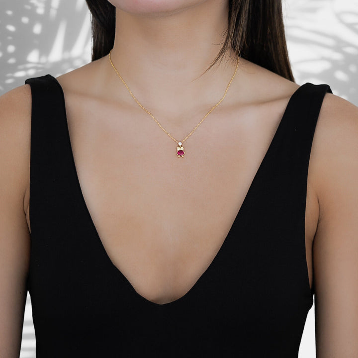This necklace is made of sterling silver with an 18K gold plating. It features a natural ruby stone and CZ diamonds. The chain is 16 inches with a 2-inch extender, and the pendant is 0.3 inches in height and width.