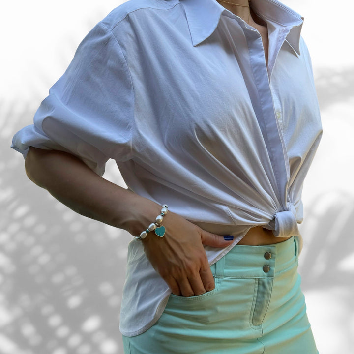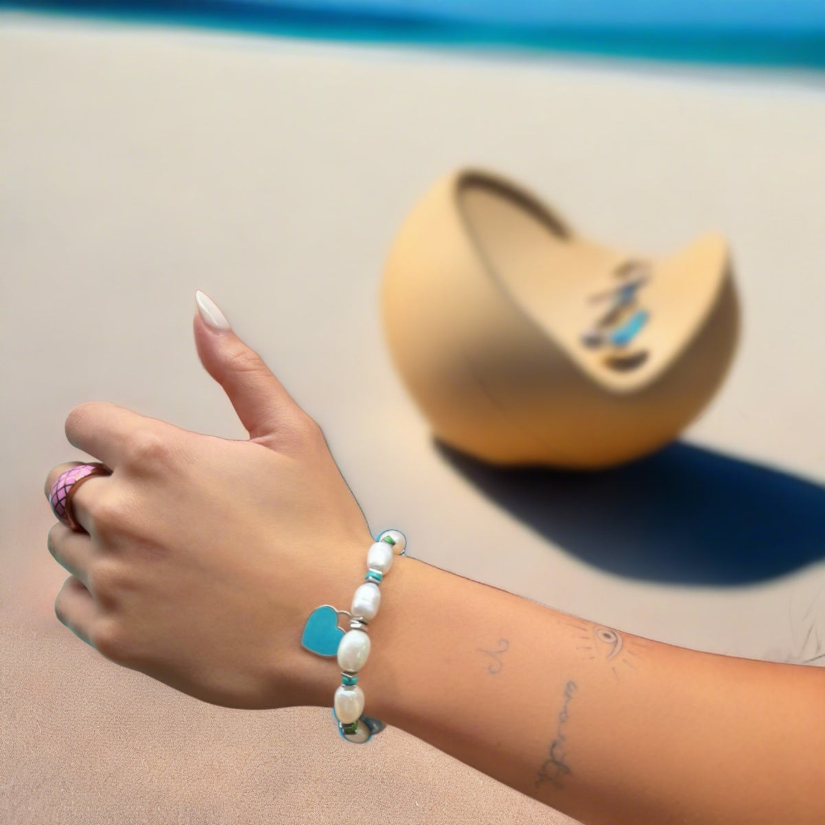 Inner Peace Blue Heart Charm Pearl Beaded Bracelet - White
