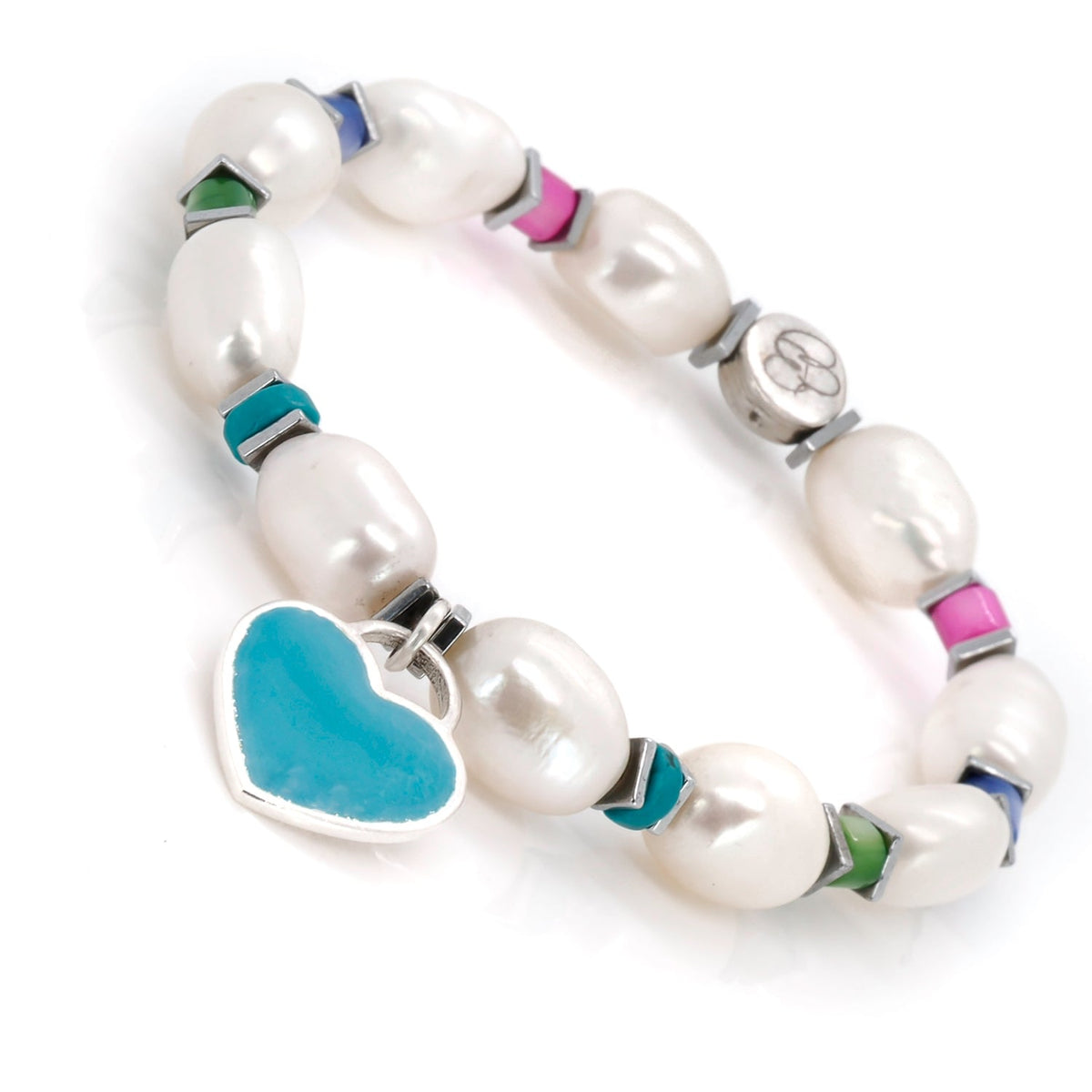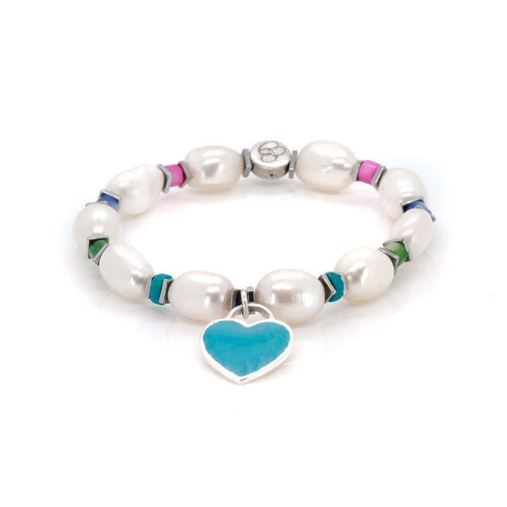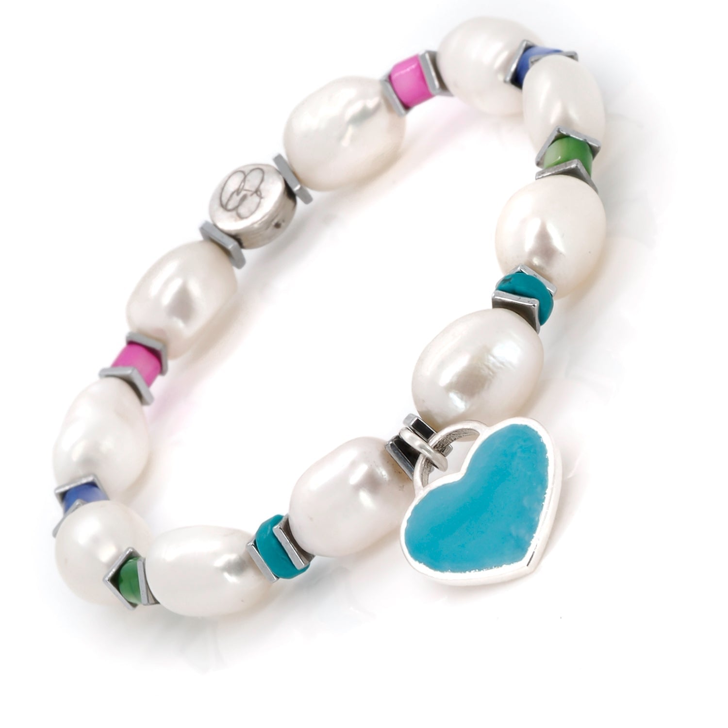 This bracelet is crafted with white pearl beads, silver-colored hematite stone spacers, and a 925 sterling silver blue enamel heart charm. The bracelet size is 6.5 inches.