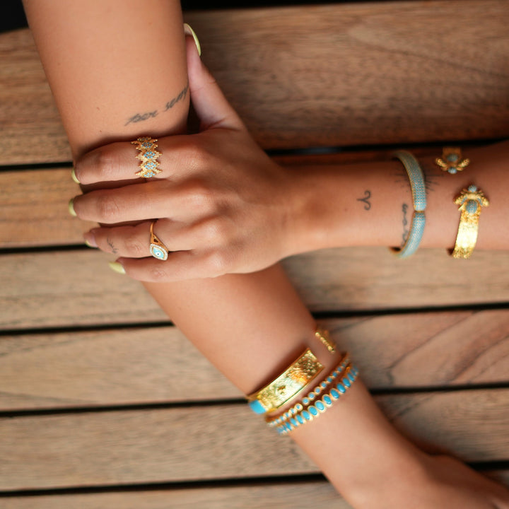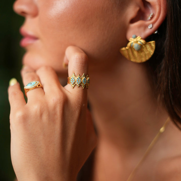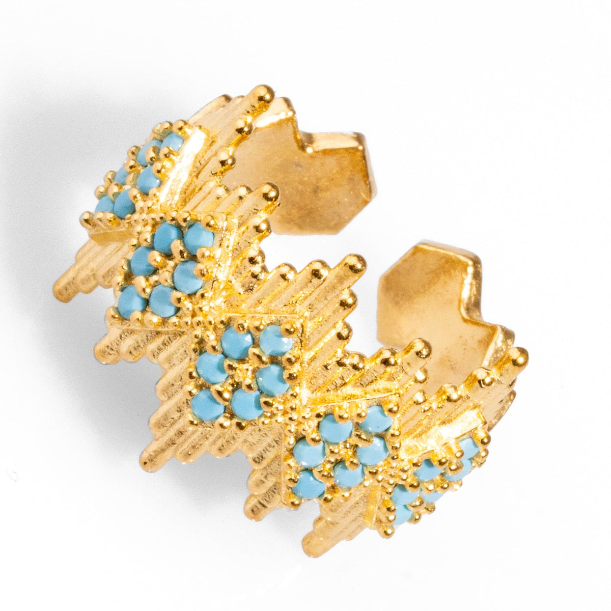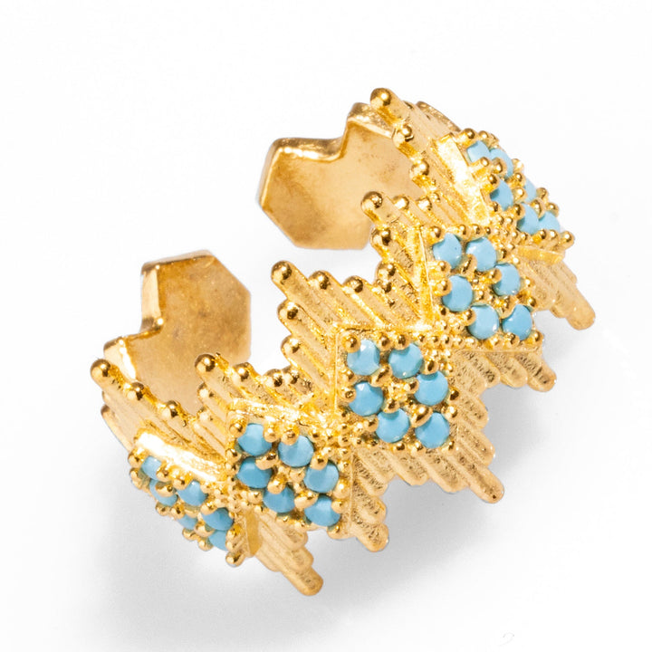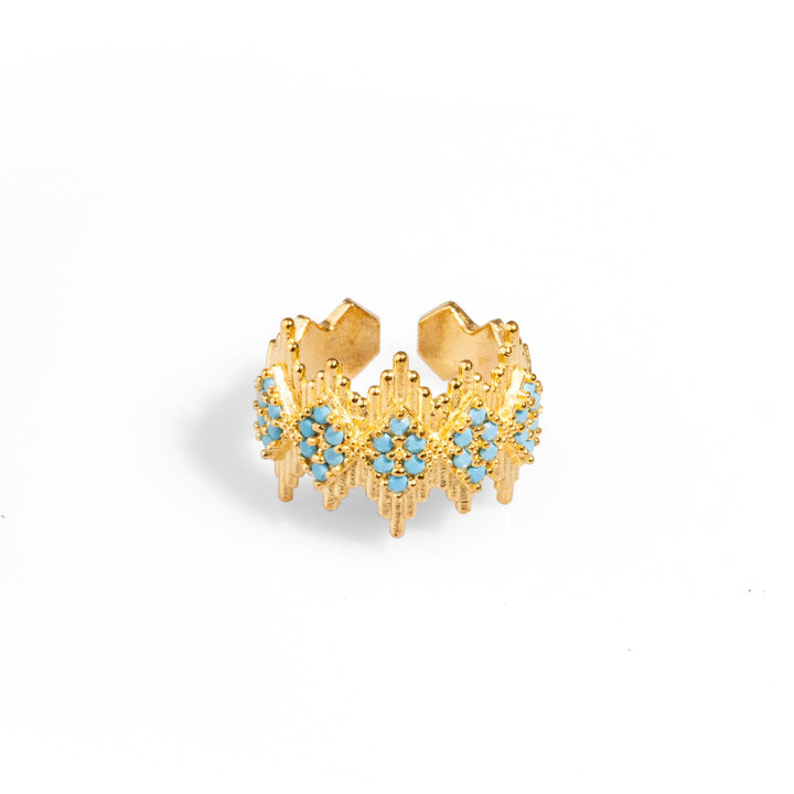 This adjustable ring is crafted from high-quality brass and plated with 24k gold. It features natural turquoise stones.