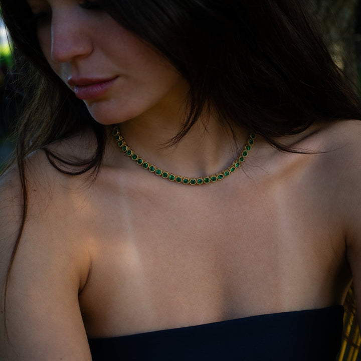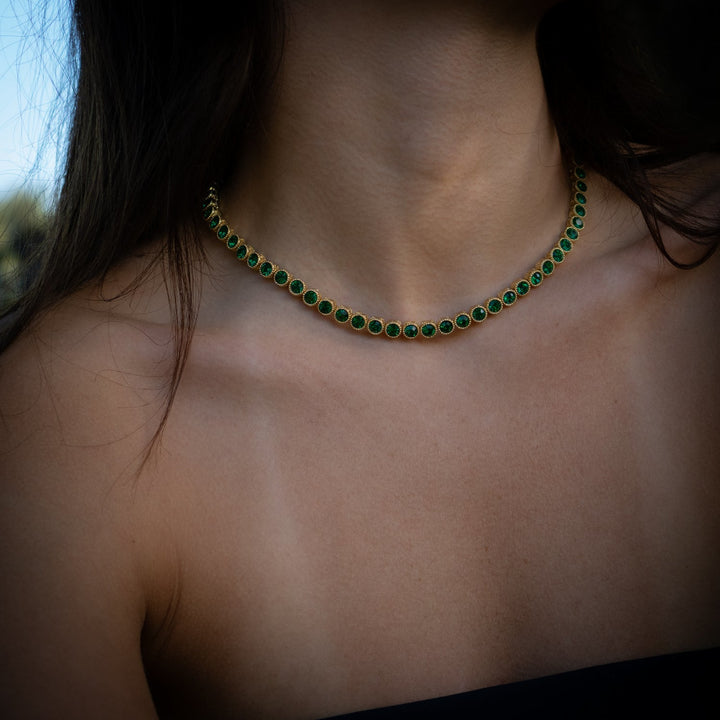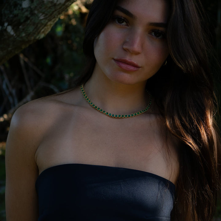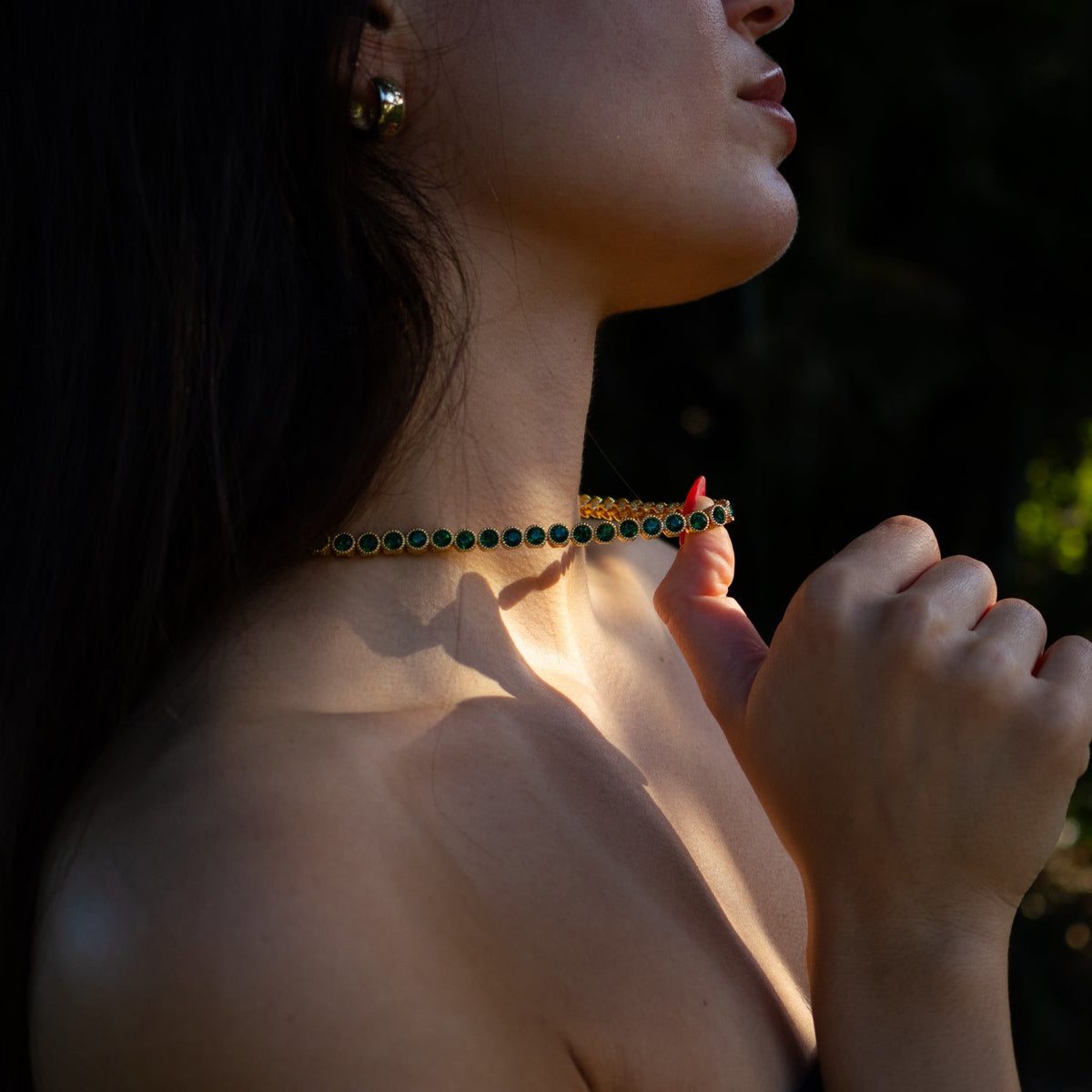 The Emerald Tennis Mystic Necklace by Ebru Jewelry is a stunning choker that blends timeless elegance with bold energy. Crafted from gold-plated bronze and featuring radiant emerald gemstones, this necklace exudes sophistication and mysticism. Emerald is known as the stone of wisdom and love, enhancing intuition and emotional balance, making this piece a vibrant and meaningful addition to any look.