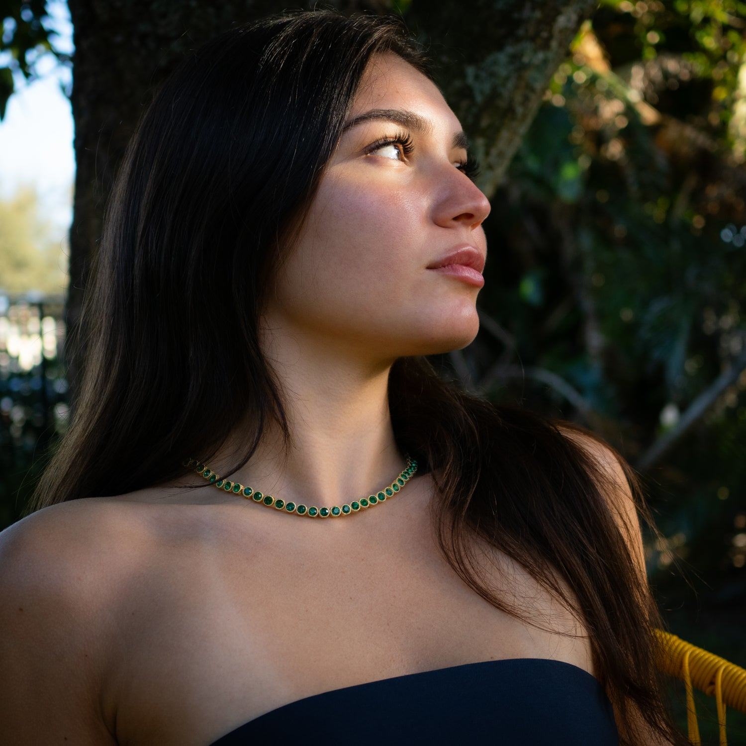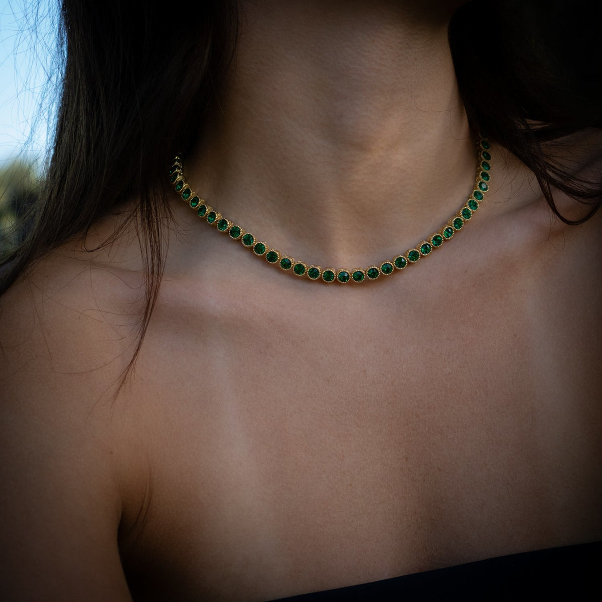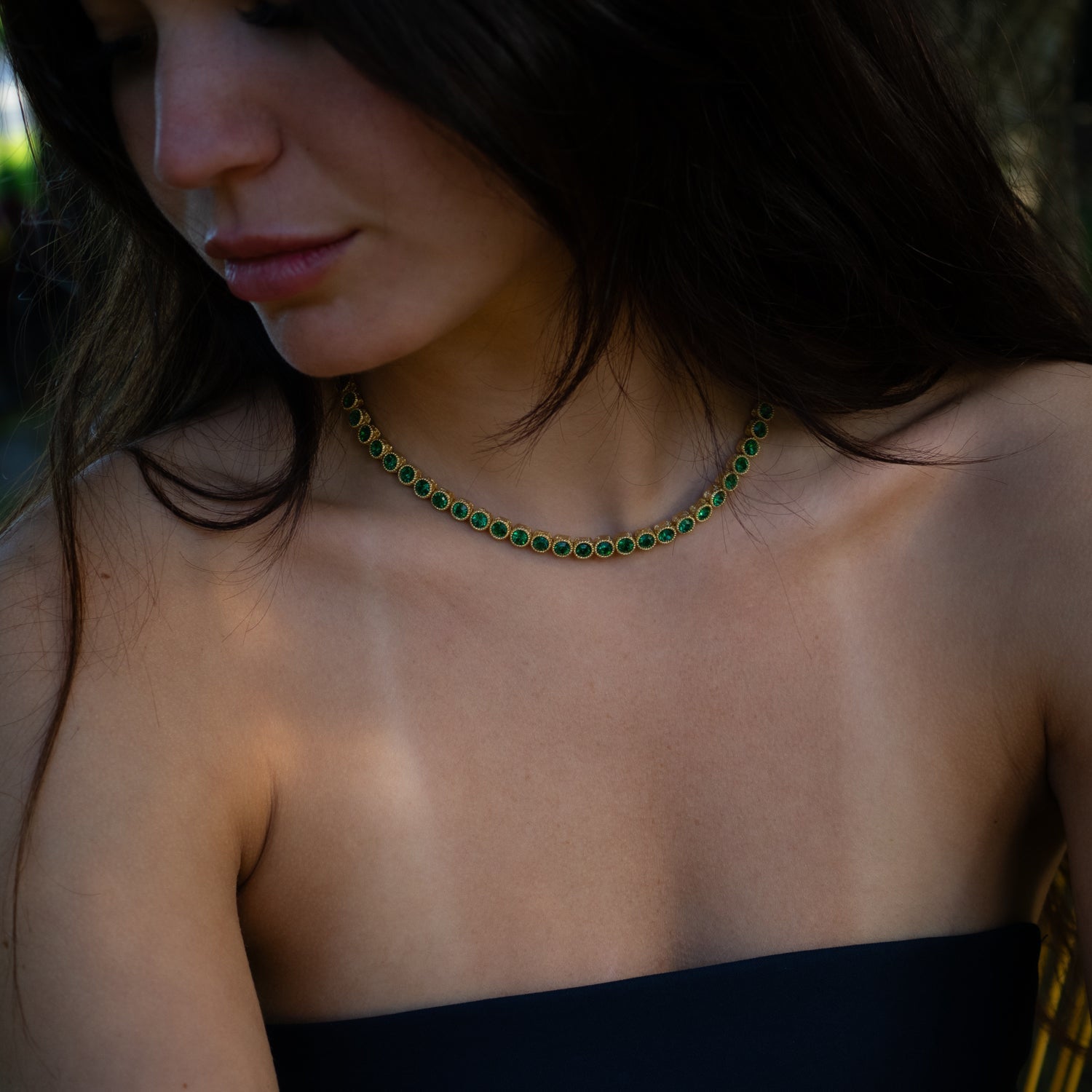 This choker necklace is crafted on a bronze base with gold plating and features natural emerald stones. The necklace is 16 inches long.